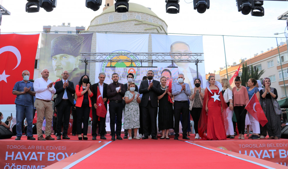 Toroslar Belediyesi’nin Hayat Boyu Öğrenme Etkinliği, milli duyguları da doruklara çıkardı. Türk Bayrağı motifinin işlenerek hazırlandığı kıyafet de katılımcılardan tam not aldı. 10.Yıl Marşı ile sahnede sergilenen bu çalışma da ayakta alkışlandı.