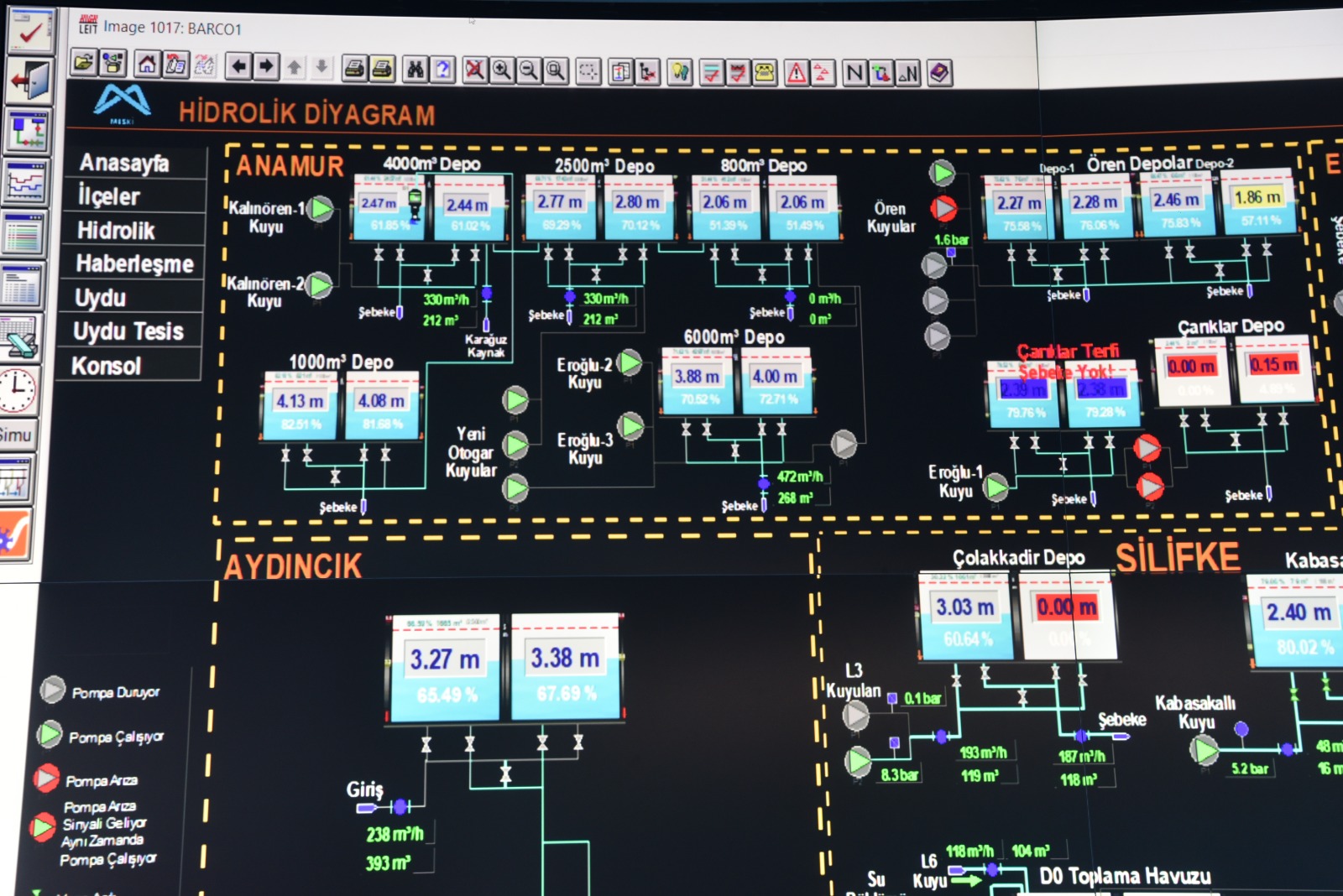 MESKİ Genel Müdürlüğü’nün coğrafi olarak zor koşullarda hizmet verdiği Anamur ilçesinde bulunan içmesuyu depoları, kuyular ve ölçüm istasyonlarının üst düzey teknolojik cihazlarla SCADA Merkezi’nde 7 gün 24 saat takibi yapılmaya başlandı. Anamur ilçe merkezinde günlük, aylık, yıllık olarak içmesuyu depolarına giren ve çıkan su miktarlarının sayısal değerleri kayıt altına alınıyor. Alınan verilere göre kullanılan su miktarı belirlenerek, kaçak kullanımının da önüne geçiliyor. Debi değerlerinde farklılıkların anında tespiti yapılarak bir damla suyun bile israf edilmemesi hedefleniyor.
