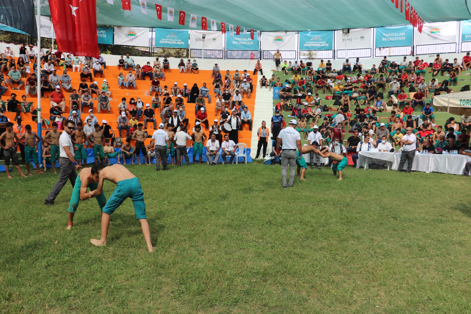 Gözne Güreş alanı Türk bayraklarıyla kırmızı beyaza boyandı. Güreşler, Toroslar Belediyesi Halk Oyunları ekibinin gösterisiyle şenlendi.