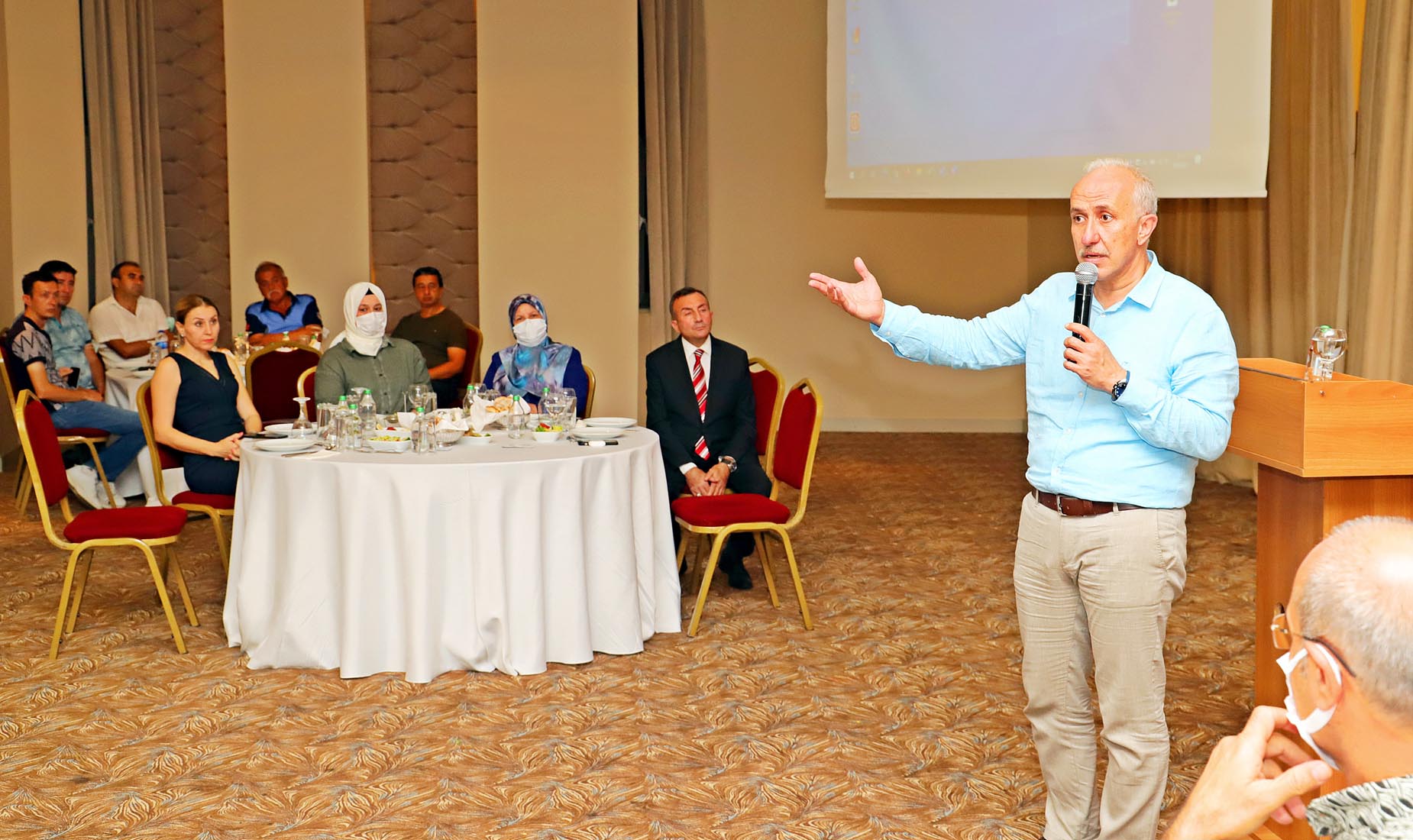 Akdeniz Belediye Başkanı M. Mustafa Gültak; “Zabıta Haftası ve Zabıta Teşkilatının Kuruluşunun 195’inci Yıldönümü” nedeniyle düzenlenen etkinlikte, Zabıta Müdürlüğü personeli ile bir araya geldi. Yemekli buluşmaya, Akdeniz Belediye Başkanı M. Mustafa Gültak ve eşi Behiye Gültak, Zabıta Müdürü Ufuk Sivaslıoğlu ve eşi, Başkan Yardımcıları, Birim Müdürleri ve Zabıta Müdürlüğü personeli ve aileleri katıldı. Saygı Duruşu ve İstiklal Marşı ile başlayan buluşmada, Akdeniz Zabıtası’nın 2021 yılında ilçe genelinde vatandaşlara sunduğu hizmetleri anlatan bir videonun sunumu gerçekleşti. “Belediyenin vizyon müdürlüklerinden birisi” Buluşmada bir konuşma yapan Başkan Mustafa Gültak, Zabıta Müdürlüğünün, belediyenin en önemli birimlerden biri olduğunu belirterek; “Çünkü toplum sağlığını ilgilendiren birçok konuya bakıyorsunuz. Hayvan haklarından tutun daha birçok hizmeti yerine getiriyorsunuz. Zabıta; belediyenin vizyon müdürlüklerinden bir tanesi. Göreve geldikten sonra zabıta ekibimizi güçlendirdik. Bu sayede birçok başarıya imza attınız. Hepinize teşekkür ediyorum. Haftanız kutlu olsun” dedi. “7/24 görevimizin başındayız” Akdeniz Zabıta Müdürü Ufuk Sivaslıoğlu da konuşmasında, 1826 yılında kurulan Zabıta Teşkilatı’nın 195 yıldır halkın sağlığı, huzuru ve esenliği için görevinin başında olduğunu, vatandaşlara hizmet verdiğini ifade etti. Sivaslıoğlu, “Sayın Başkanımızın müdürlüğümüze verdiği büyük destek sayesinde, büyük bir özgüven ile yolumuza devam ediyoruz. Sahip olduğu sanayi tesisleri ile gündüz nüfusu 800 bini bulan Akdeniz’e hizmet veriyoruz. Halkımızın mutluluğu ve güvenliği için gecemizi gündüze katarak 7-24 çalışmaya devam edeceğiz” diye konuştu. Konuşmaların ardından Başkan Gültak; Zabıta Müdürü Sivaslıoğlu ile birlikte Zabıta Teşkilatının Kuruluşunun 195’inci Yıldönümü dolayısıyla pasta kesti; Ayrıca önümüzdeki günlerde emekli olacak 2 zabıta müdürlüğü personeline de plaket takdim ederek emeklerinden ötürü teşekkür etti.