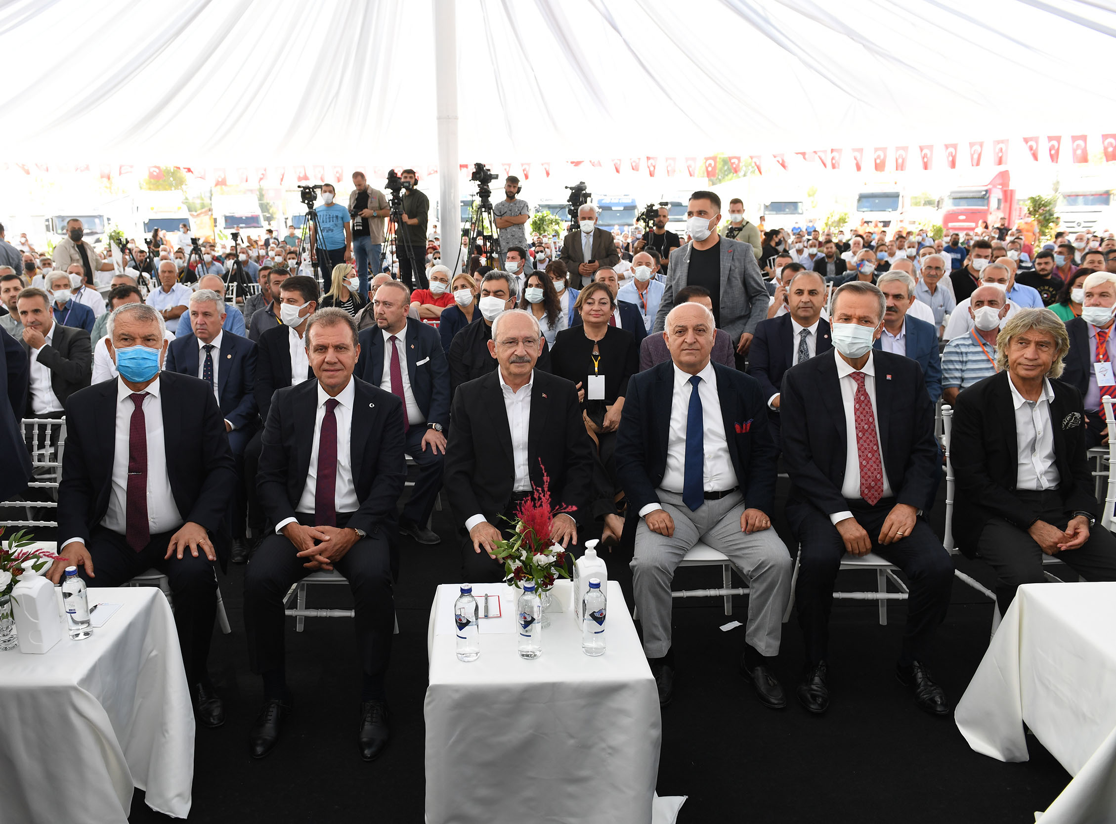 CHP Lideri Kılıçdaroğlu’nun öncülüğünde Mersin Büyükşehir Belediyesi Tır Garajı’nda düzenlenen Büyük Nakliyeci Buluşması’na, CHP Genel Başkan Yardımcıları, Genel Merkez yöneticileri, Parti Meclisi üyeleri, milletvekilleri, Mersin Büyükşehir Belediye Başkanı Vahap Seçer, Adana Büyükşehir Belediye Başkanı Zeydan Karalar, siyasi partilerin il ve ilçe örgütleri, sivil toplum kuruluşları ve sektör temsilcileri katıldı.