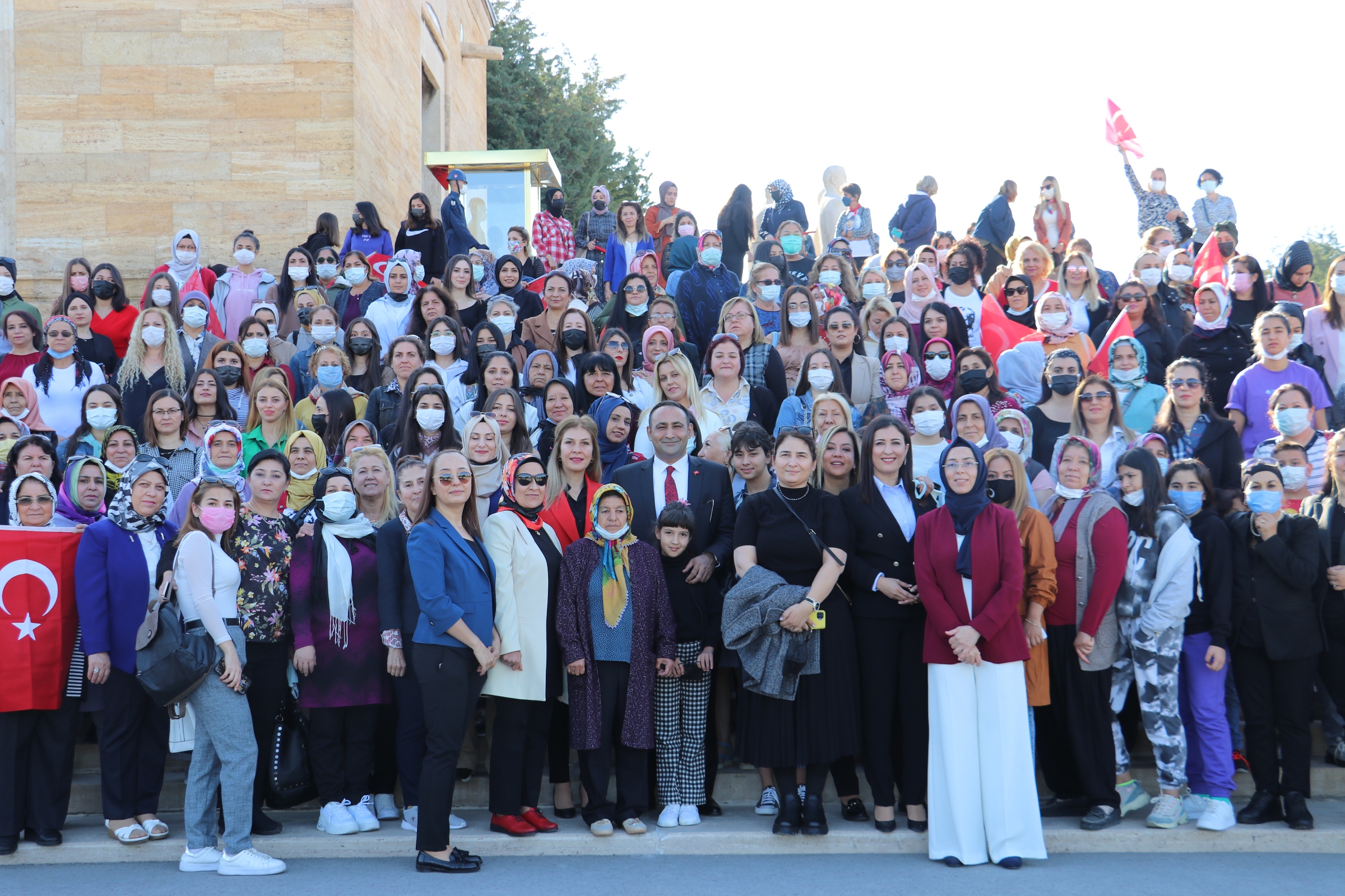 350 kadınla Ata’nın manevi huzuruna çıkan Başkan Yılmaz’a, eşi Meltem Yılmaz ve kızları da eşlik etti.