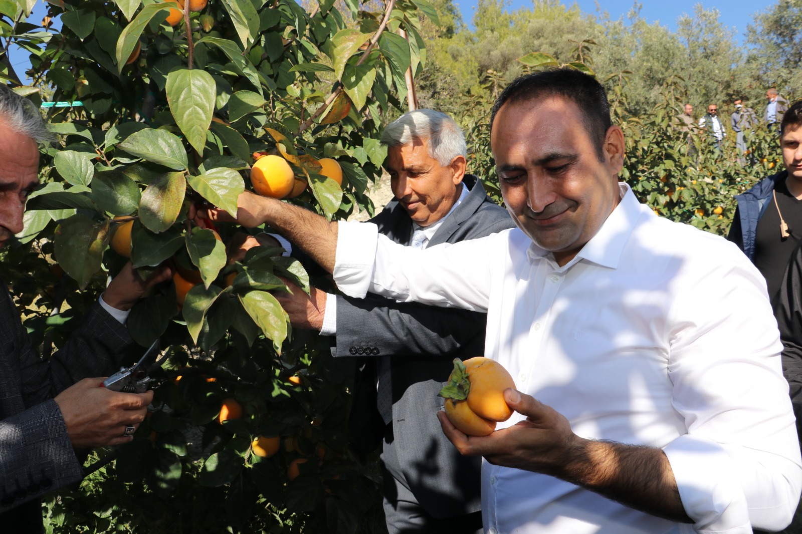 Başkan Yılmaz, daha sonra ilçe protokolü ve çiftçilerle birlikte hurma bahçesine giderek ağacından hurma hasadı yaptı, üreticilerden paketleme ve sevk işlemleri ile ilgili bilgiler de aldı.