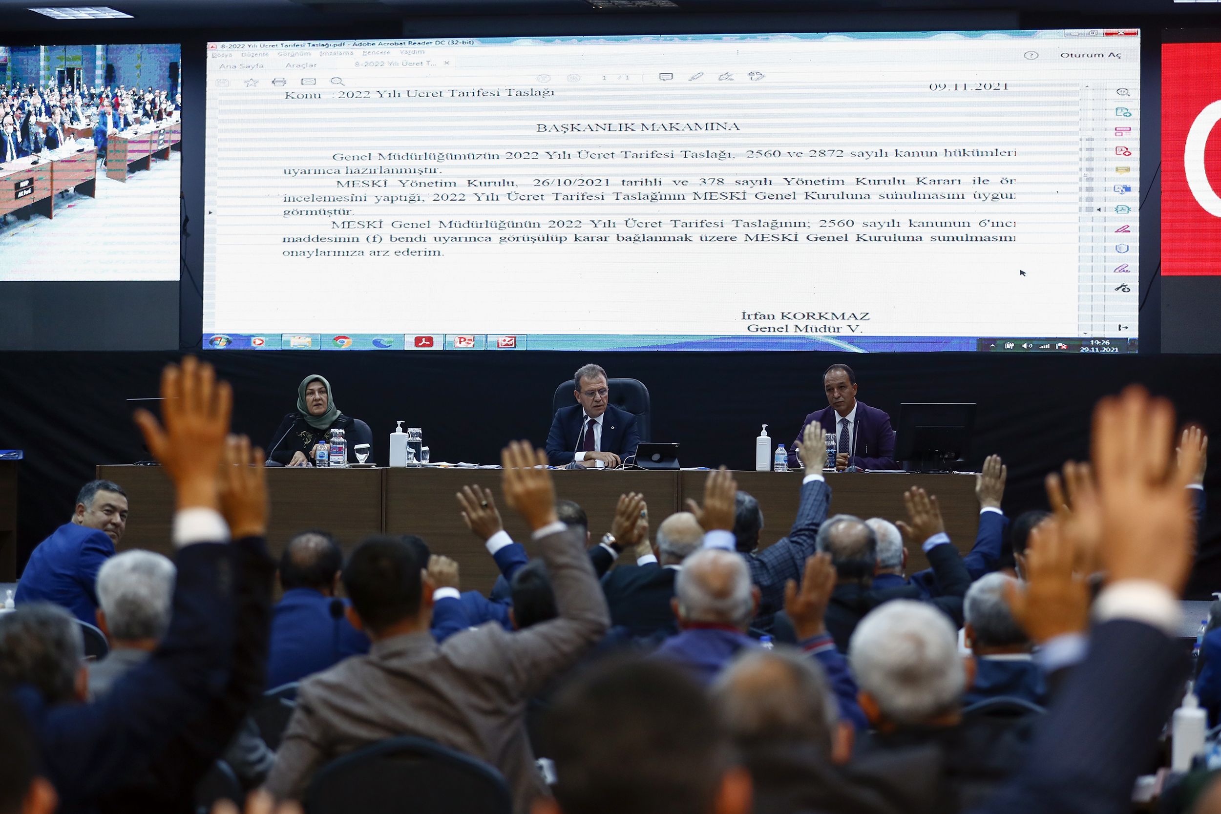 Genel Kurul’da MESKİ’nin ücret tarifesine ilişkin madde reddedilirken, 2022-2024 Dönemi Bütçe Tasarısı ile oy çokluğuyla kabul edildi. Başkan Seçer,“Kurumumuza hayırlı uğurlu olsun. Ama problemli bir bütçe olmuştur. Ayağı sakat bir bütçe olmuştur. Mevzuat gereği gelir azaltıcı ya da gider arttırıcı konuda herhangi bir karar almamız, değişiklik yapmamız mümkün değildir. Bu açıdan teknik bir sorun oluşmuştur. Bunun tabi ki hukuk yollarıyla çözümü için gerekli girişimlerde bulunacağız” dedi.