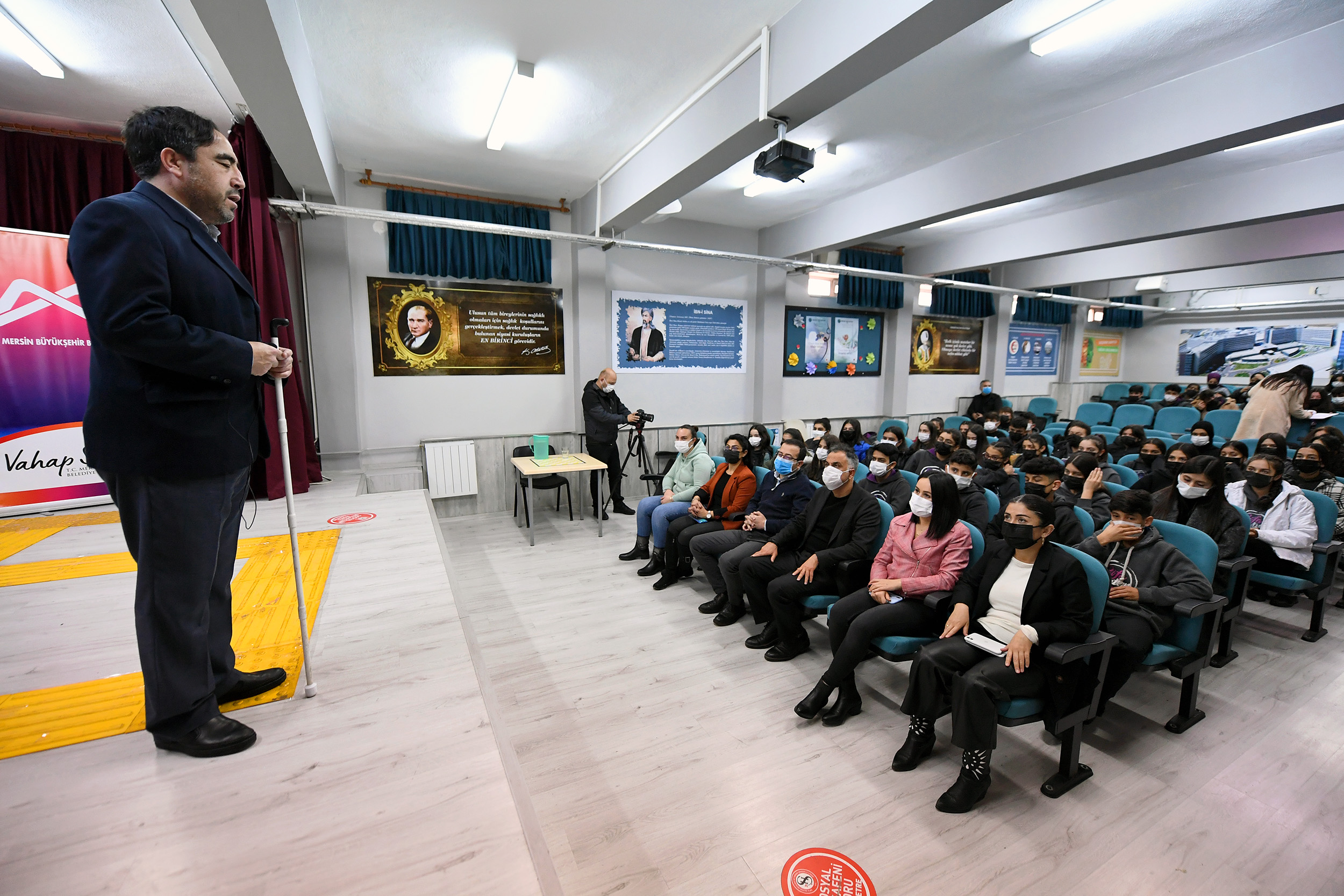 Mersin Halk Eğitimi Merkezi’nde sınıf öğretmenliği yapan ve görme engelli bir birey olan Ali Rıza Eşki de gözlerini kaybetme sürecini ve yaşadıklarını öğrencilerle paylaştı. Eşki, “Görme engellilere yeterince ulaşamadığımızı düşünüyorum. Bu manada bu tür etkinliklere katılmayı tercih ediyoruz. Bu kardeşlerimiz mutlaka sosyal ve toplumsal hayatta bir görme engelli ile karşılaşabiliyorlar. Mutlaka yardımcı olmaları gerektiği konusunda bilgileri var ama nasıl doğru yardım edebilirler bunun eğitimini vermeye çalıştık. Bugünkü etkinlik mutlaka faydalı oldu. Hiç unutmayacaklarını düşünüyorum” ifadelerini kullandı.