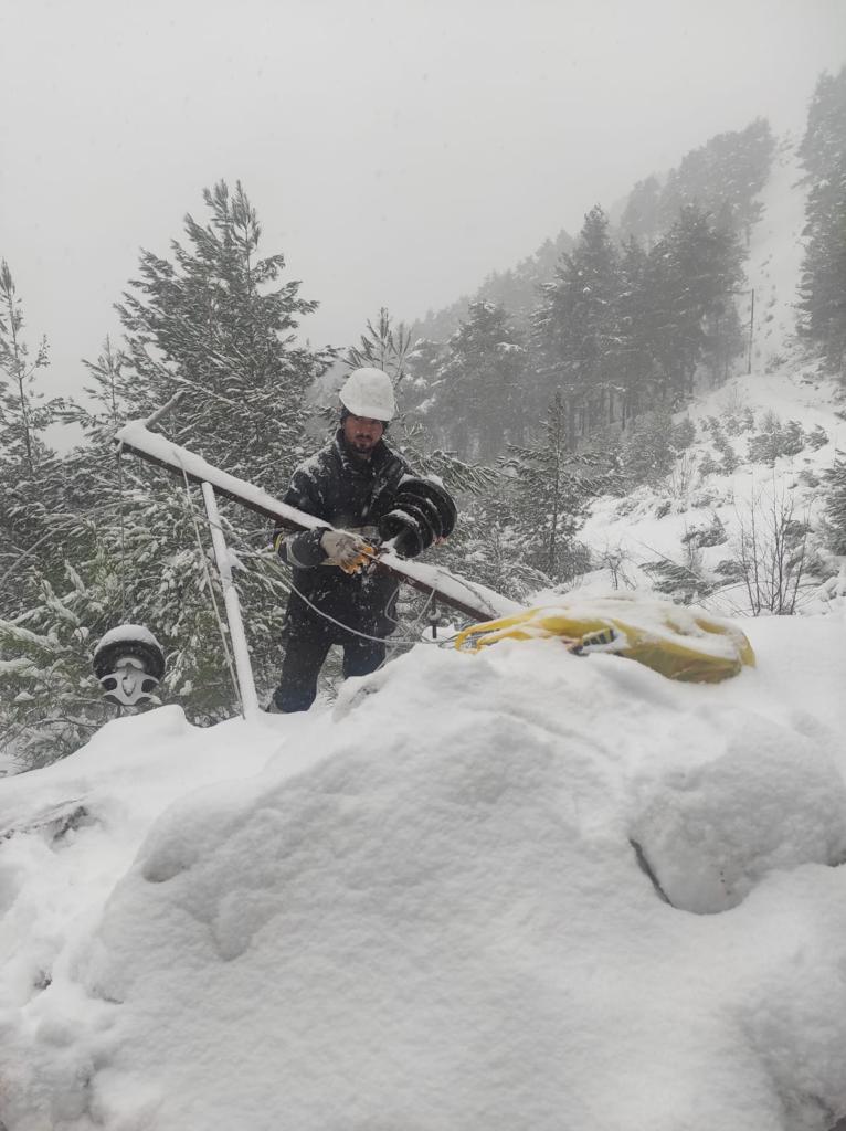 Elektrik dağıtım hizmetinin kesintisiz devam etmesi için 24 saat görev yapan Toroslar EDAŞ ekipleri, kar kalınlığının bir metreye ulaştığı zorlu arazi koşullarında çalışmalarını sürdürüyor.