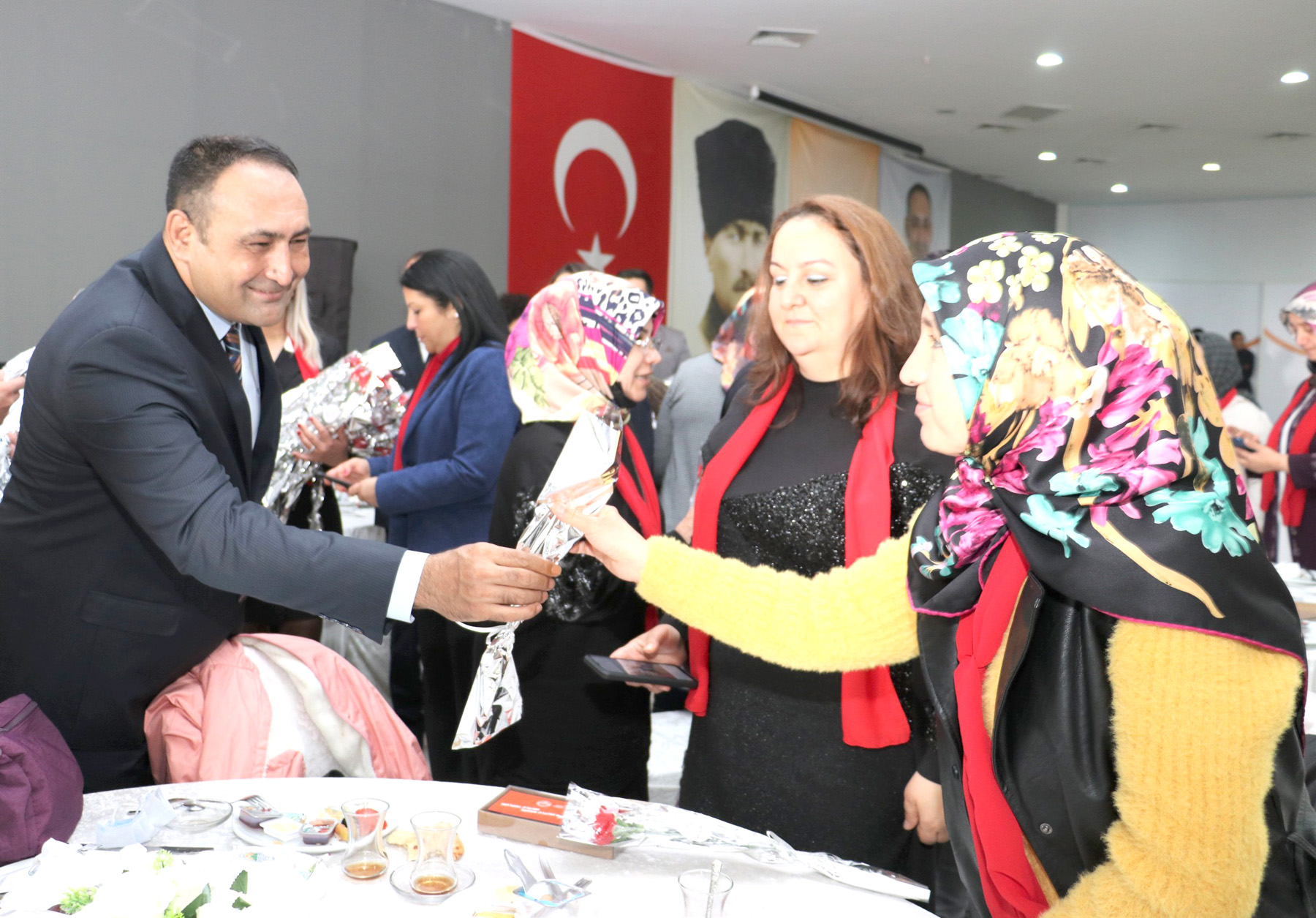 Toroslar Belediye Başkanı Atsız Afşın Yılmaz, konuşmasının ardından tüm katılımcılara tek tek karanfil vererek, günün anısına hatıra fotoğrafı çektirdi.