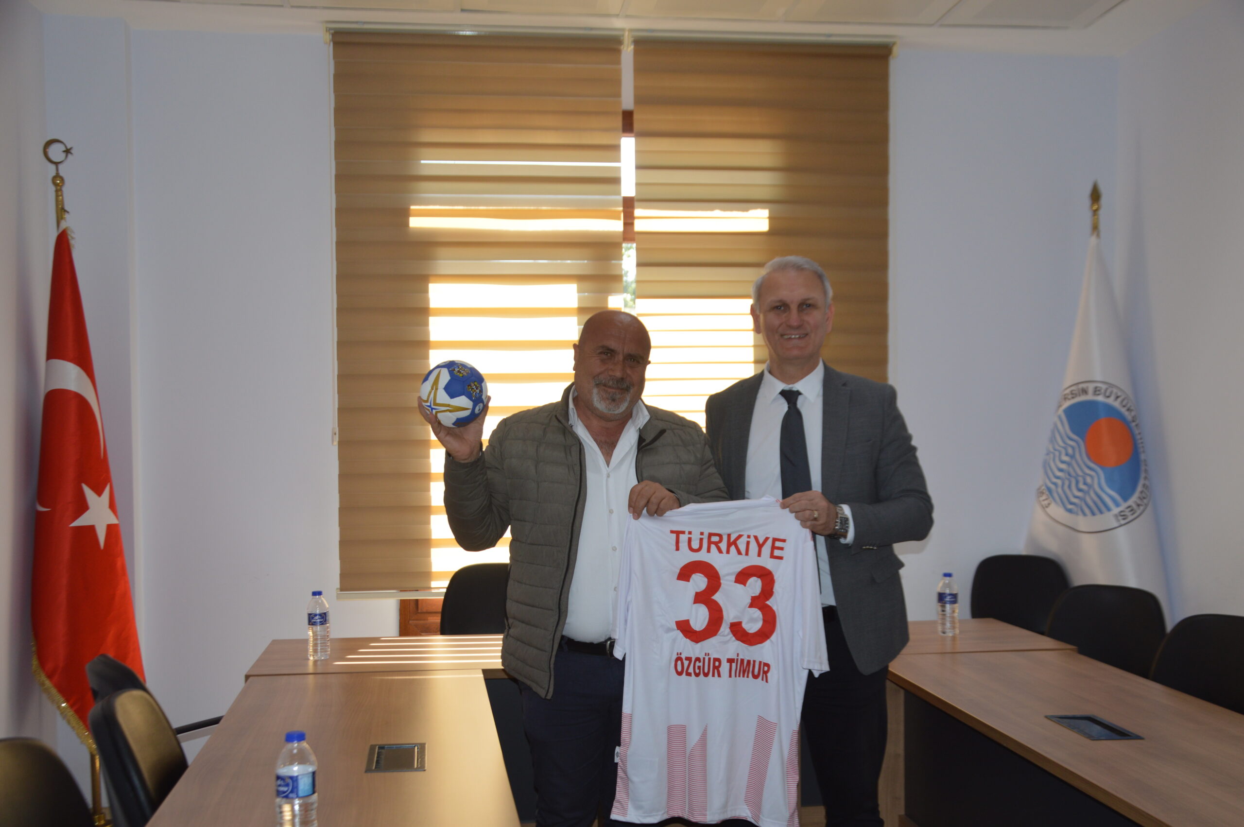 Başkan Kılıç, MSK Başkanı Özgür Timur ve Mersin İdman Yurdu Spor Kulübü Hentbol Şube Başkanı Abdullah Öztürkmen’e Türkiye Hentbol Milli Takımı forması ve hentbol topu hediye etti.
