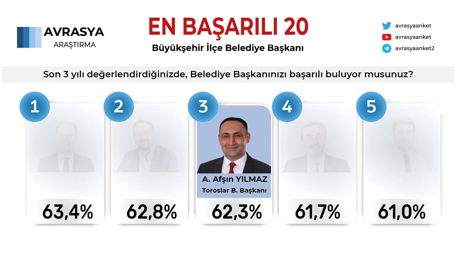 Avrasya Araştırma Şirketi tarafından yapılan “En Başarılı 20 Büyükşehir İlçe Belediye Başkanı” anketinde halkın teveccühü ile en başarılı 3’üncü belediye başkanı seçilen Başkan yılmaz, yine ORC Araştırma Şirketi’nin hazırladığı son 3 yılın en başarılı 10 ilçe belediye başkanları arasında yüzde 62,4 oranla ikinci sırada yerini aldı.