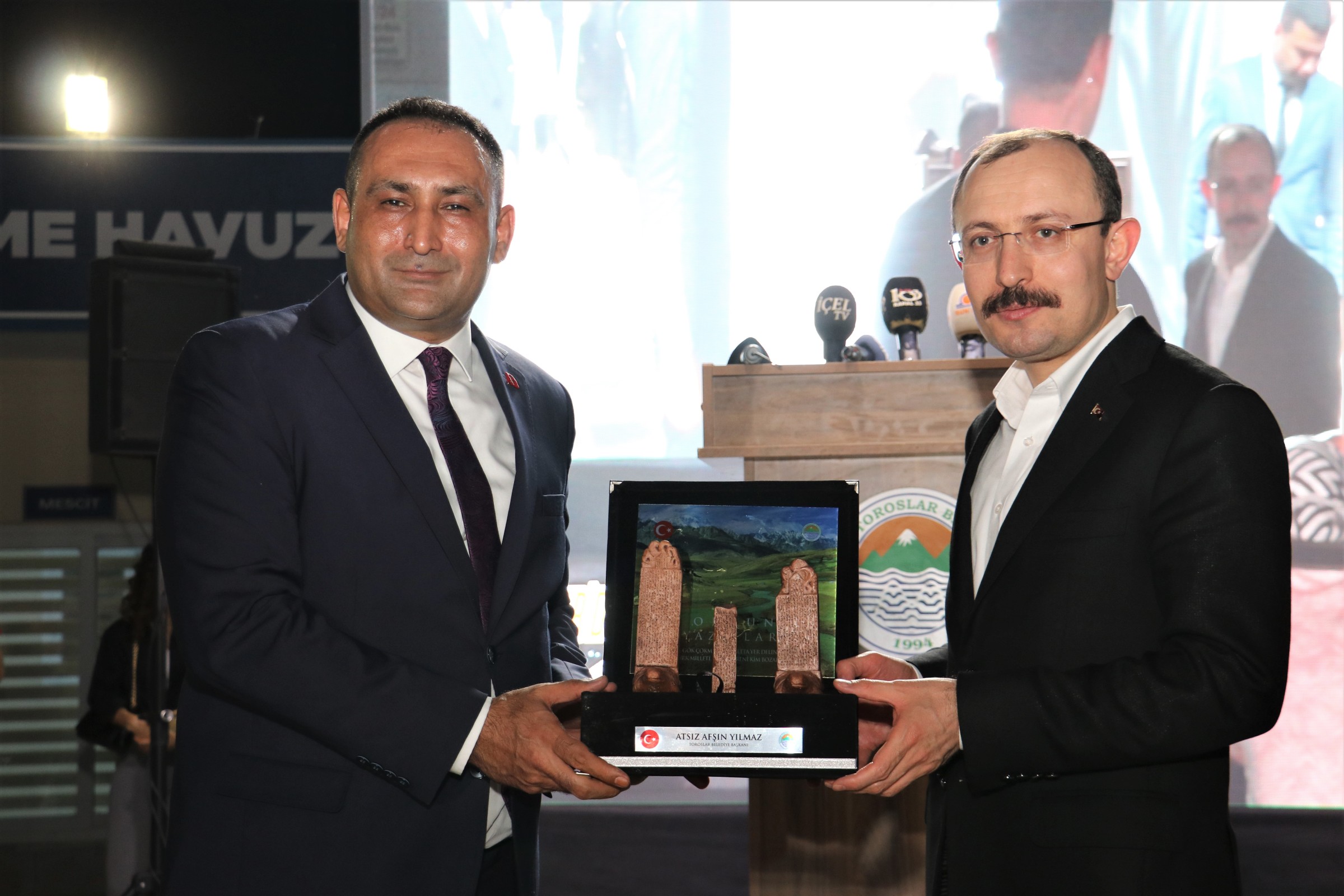 Toroslar Belediye Başkanı Atsız Afşın Yılmaz, Ticaret Bakanı Mehmet Muş’a; Türk dili, kültürü ve tarihinin en değerli anıtlarından olan Orhun Yazıtları’nın minyatür örneğini hediye ederek teşekkür etti.