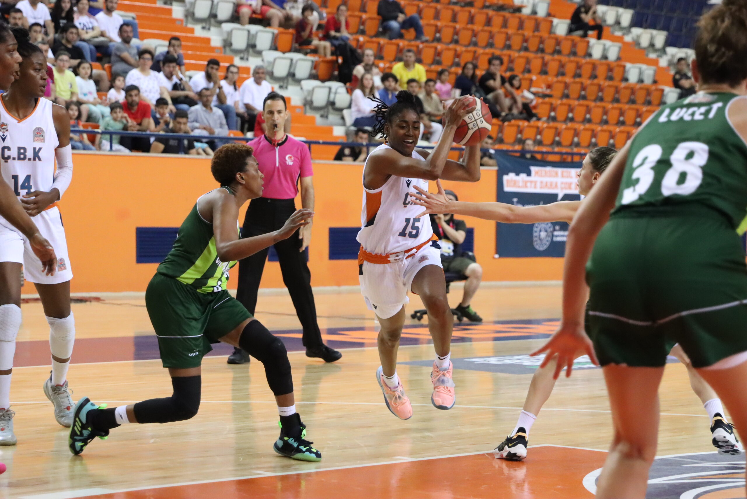 Mücadeleye Asena Yalçın, Sinem Ataş, Temi Fagbenle, Tiffany Hayes ve DeWanna Bonner 5’i ile başlayan Çukurova ilk çeyreği 16-10 önde kapatırken, devre 34-28 sona erdi. Konuk ekip OGM Ormanspor, karşılıklı basketlerin atıldığı 3’üncü periyotun tamamlanmasına 1 dakika 28 saniye kala skoru 45-43’e getirip farkı 2 sayıya kadar düşürdü. Mücadelenin bu bölümünde turnikeye giden rakibine blok yapan Fagbenle, skorun eşitlenmesini önledi. Pozisyonun hemen ardından hızlı hücum eden ÇBK’da Bonner, durumu 47-45’e getirirken, periyot böyle son buldu.