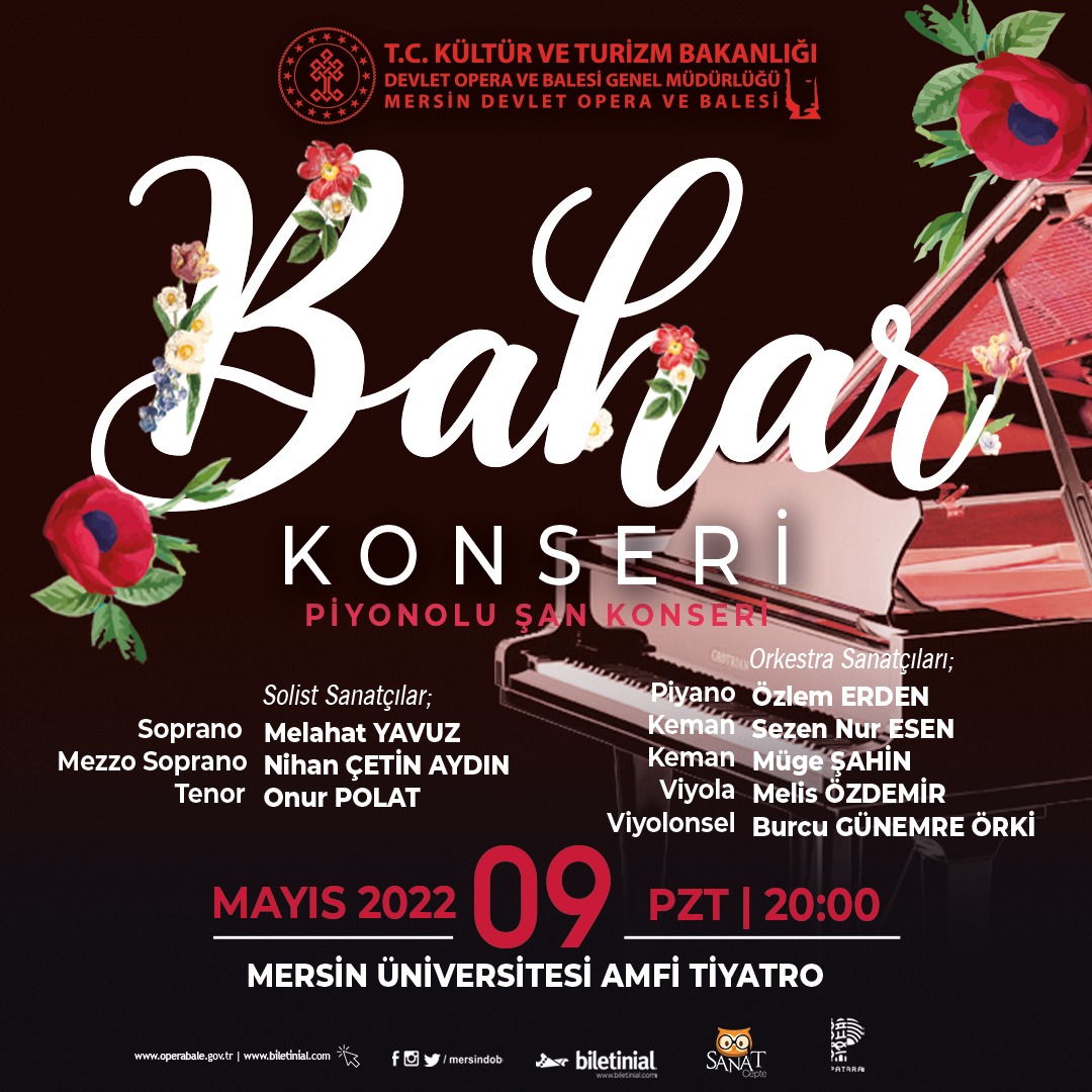 Mersin Devlet Opera ve Balesi, 9 Mayıs Pazartesi günü saat 20:00’ de Mersin Üniversitesi Amfi Tiyatro’da “Bahar Konseri” ni sahneleyecek. Mersin Devlet Opera ve Balesi, muhteşem bir konserde izleyici ile buluşmaya hazırlanıyor. Mersin Üniversitesi’nin 30. Yılı kutlamaları kapsamında 9 Mayıs 2022 Pazartesi saat 20:00’da, Mersin Üniversitesi Amfi Tiyatroda gerçekleşecek olan Piyanolu Şan Konserinin Solist Sanatçıları; Melahat Yavuz, Nihan Çetin Aydın, Onur Polat olacak. Orkestra Sanatçıları ise; piyanoda Özlem Erden, kemanda Sezen Nur Esen ve Müge Şahin, viyolada Burcu Günemre Örki sahne alacak. Türküler ve Napolitenlerin seslendirileceği konser izleyicilerin beğenisine sunulacak.