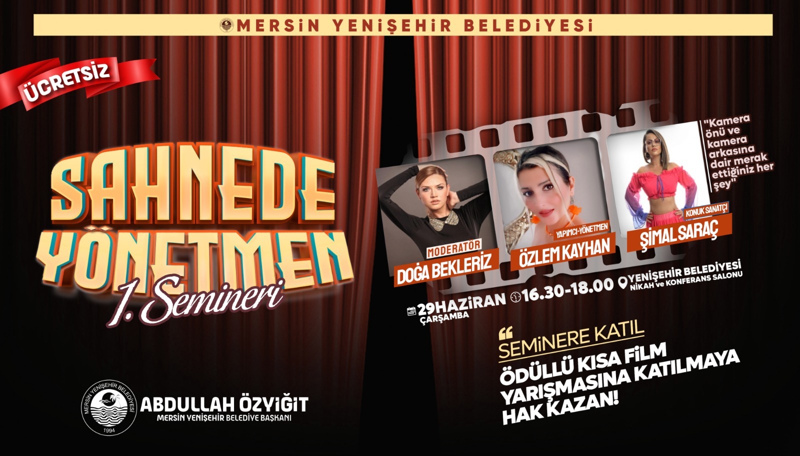 Yenişehir Belediyesi tarafından düzenlenen ve televizyonculuğa dair merak edilenlerin konuşulacağı “Sahnede Yönetmen” semineri 29 Haziran Çarşamba günü saat 16.30’da yapılacak. Seminere katılanlar daha sonra Metin Arolat’ın jüri üyeliğinde düzenlenecek ödüllü kısa film yarışmasına da katılma hakkı kazanacak. Yenişehir Belediyesi, sinema ve televizyonculuğa ilgi duyan vatandaşlar için “Sahnede Yönetmen” semineri düzenliyor. Uğur Dündar, Mehmet Ali Birand ve Mesut Yar gibi duayen gazetecilerin programlarında yönetmenlik yapan ünlü yapımcı ve yönetmen Özlem Kayhan’ın konuşmacı olarak yer alacağı seminerin moderatörlüğünü ise yine ünlü oyuncu ve sunucu Doğa Bekleriz yapacak. Ayrıca Şimal Saraç da seminere konuk sanatçı olarak katılacak. Yenişehir Belediyesi ana hizmet binası içerisinde bulunan Yenişehir Belediyesi Nikâh ve Konferans Salonu’nda ücretsiz düzenlenecek “Sahnede Yönetmen” semineri ile film ve televizyon programı yönetimi, filmlerin yapım süreci,canlı yayınlar, kamera önü ve kamera arkasına dair katılımcılara bilgiler verilecek. “Sahnede Yönetmen” semineri ile ilgili konuşan Özlem Kayhan, “Uzun yıllar çalıştığım ulusal projelerdeki deneyimlerimi, bu seminerle memleketim Mersin’de gençler başta olmak üzere televizyonculuğailgi duyan herkesle paylaşmak istedim.” ifadelerini kullanarak, vatandaşları seminere davet etti.
