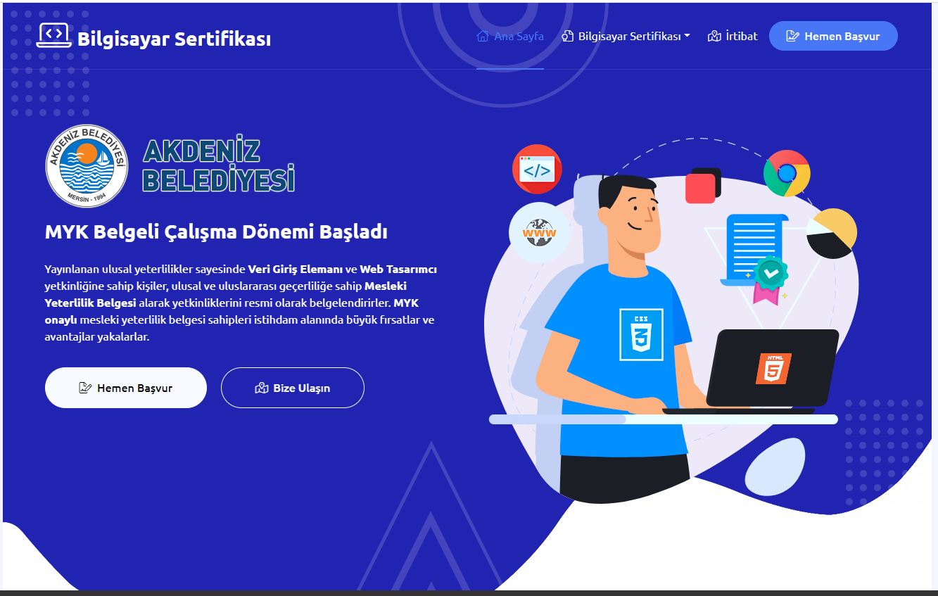 Akdeniz Belediyesi, ilçe sınırlarında ikamet eden üniversite mezunlarının ‘Mesleki Yeterlilik Belgesi’ sahibi olabilmeleri amacıyla dev bir proje başlattı. Proje sayesinde Akdeniz, belgelendirme faaliyeti yürüten ilk belediye olma başarısı elde etti. Akdeniz Belediyesi, Türkiye’de bir ilki daha gerçekleştiriyor. Proje kapsamında Akdeniz ilçe sınırları içerisinde ikamet eden üniversite mezunları, “Veri Giriş Elemanı” ve “Web Çoklu Ortam Geliştirici (Web Tasarımcı)” mesleklerinde sınava girerek, ulusal ve uluslararası geçerliliğe sahip Mesleki Yeterlilik Belgesi alabilecek. Belgelendirme faaliyeti yürüten ilk belediye… Akdeniz Belediyesi, yürüttüğü proje sayesinde Türkiye’de Mesleki Yeterlilik Kurumu (MYK) onaylı protokol kapsamında, belgelendirme faaliyeti yürüten ilk belediye olma başarısını da yakalamış oldu. Akdeniz Belediyesi Kültür ve Sosyal İşler Müdürlüğü tarafından yürütülen proje kapsamında belge sahibi olmak isteyen adaylar Akdeniz Belediyesi Kültür ve Sosyal İşler Müdürlüğü’ne bizzat başvurarak veya www.bilgisayarsertifikasi.com web adresi üzerinden online olarak başvuruda bulunabilir. Mesleki Yeterlilik Belgesi Nedir? Mesleki Yeterlilik Belgeleri, sadece Türk Akreditasyon Kurumu (TÜRKAK) tarafından akredite edilmiş ve MYK tarafından yetkilendirilmiş belgelendirme kuruluşları tarafından düzenlenen sınavlar sonrasında verilebilir. MYK belgesi, ulusal ve uluslararası geçerliliğe sahip resmi bir belge olma özelliği taşıyor. Böylelikle MYK belgesi, kişinin sahip olduğu yeterlilikleri resmi olarak belgelendirilmesini sağlayıp nitelikli iş fırsatları sunuyor. Belge sayesinde kişiler isterlerse yurt dışında da çalışma imkânı bulabiliyor. MYK belgesine sahip kişileri çalıştıran işyerleri, 54 aya kadar SGK teşvikleri avantajından yararlanabiliyor, bu durum MYK belgeli kişilerin işe alınmasında tercih sebebi olmasını sağlıyor.