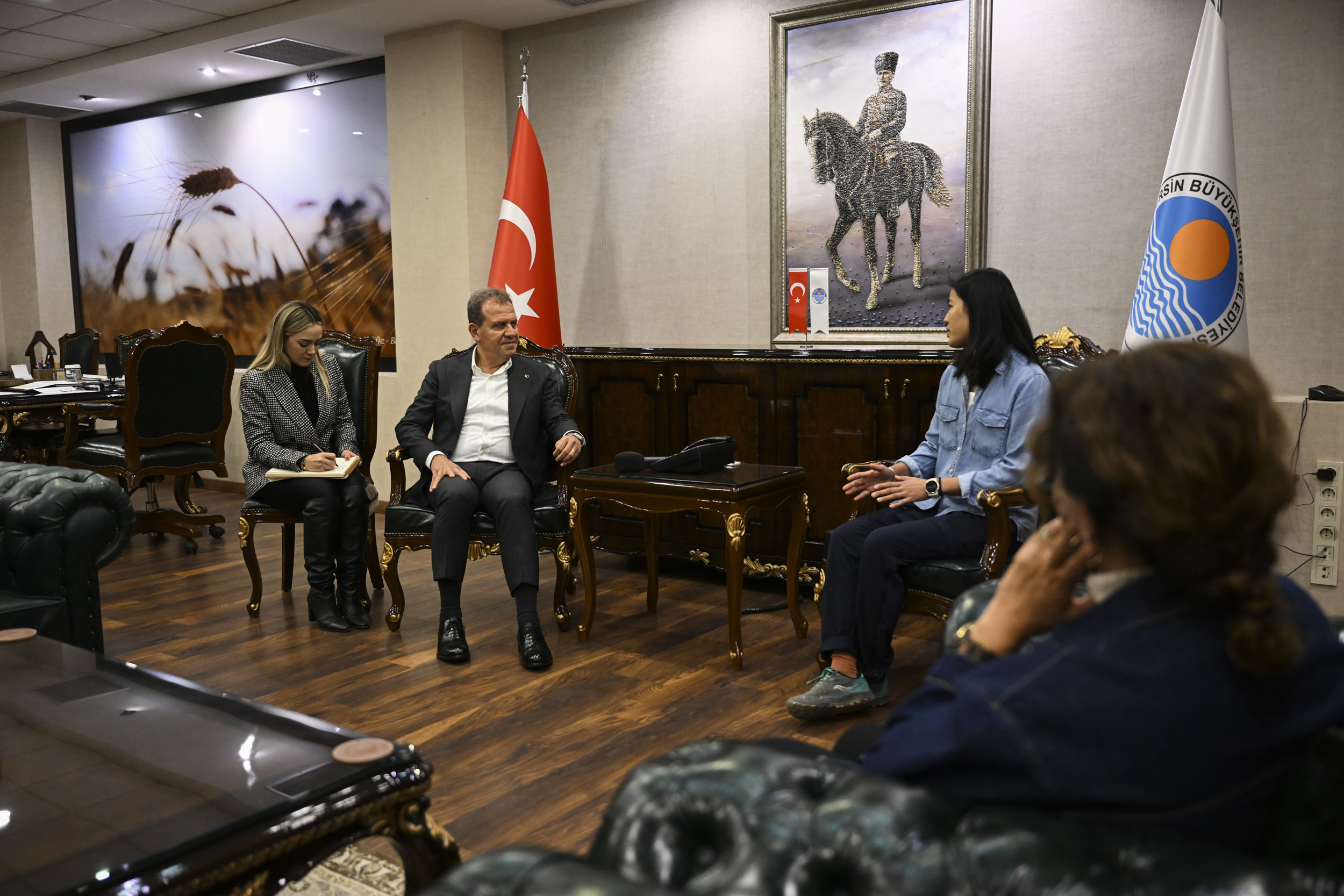 İspanya’nın Zaragoza şehrinden bu yılın Nisan ayında yola çıkan ve bisikletiyle ülke ülke gezen Sara Qiu’nun bir durağı da Mersin oldu. Gezgin Oiu, Mersin seyahatinde Büyükşehir Belediye Başkanı Vahap Seçer’i de ziyaret etti. Makamda gerçekleştirilen ziyarette; Başkan Seçer ve gezgin Qiu arasında keyifli bir sohbet gerçekleşti. Qiu, Başkan Seçer’e Mersin izlenimlerini anlattı. Ziyarette ayrıca; Mersin’de bisiklet kullanımının yaygınlaşması için öncülük eden ve birçok kurumda çalışmalar yürüten bisiklet aktivisti Ebru Petek Budur da yer aldı.
