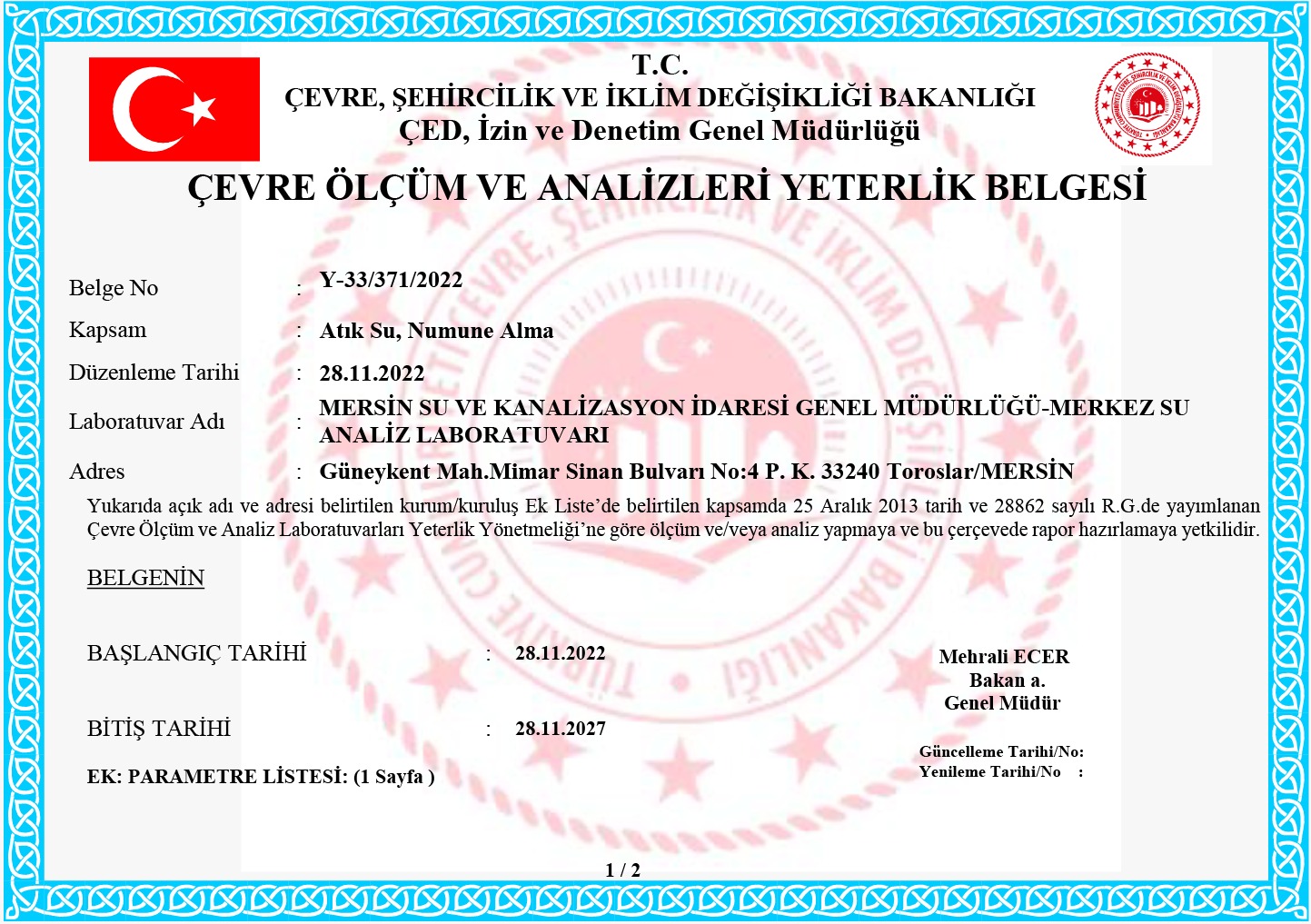 MESKİ MERKEZ SU ANALİZ LABORATUVARI, ÇEVRE, ŞEHİRCİLİK VE İKLİM DEĞİŞİKLİĞİ BAKANLIĞI TARAFINDAN “ÇEVRE ÖLÇÜM VE ANALİZ YETERLİK BELGESİ” İLE YETKİLENDİRİLDİ