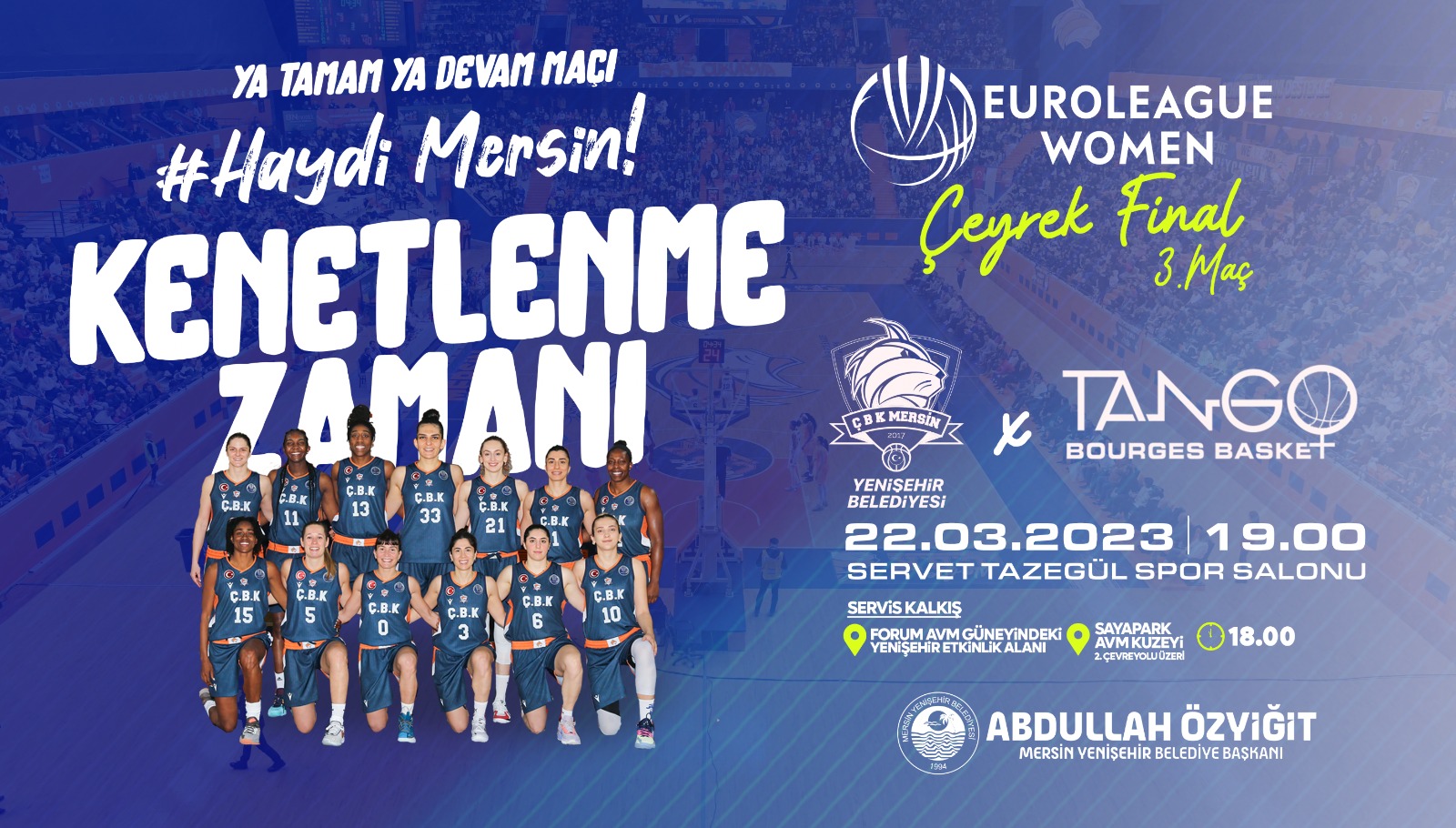 Çukurova Basketbol Kulübü(ÇBK) Mersin Yenişehir Belediyesi, Euroleague Women çeyrek finalinin üçüncü ve son maçına çıkıyor. Fransa temsilcisi Tango Bourges Basket’i sahasında ağırlayacak olan turuncu-lacivertliler kazanması halinde Avrupa’nın en büyük kupası için Final-Four’a yükselecek. Yenişehir Belediye Başkanı Abdullah Özyiğit, sezonun en kritik maçı için Mersinlileri maça davet ederek, destek çağrısında bulundu. Ülkemizi Avrupa’da kadın basketbolunun en prestijli ligi olan Euroleague Women’da temsil eden ÇBK Mersin Yenişehir Belediyesi, çeyrek final serisinin üçüncü maçında sahne alıyor. Sahasında Mersinlilerin büyük desteğiyle rakibini yenen ÇBK Mersin Yenişehir Belediyesi,deplasmanda oynadığı maçta ise mağlup rakibine bir sayı farkla mağlup oldu. Çeyrek final turunun son maçında saha avantajını elinde bulunduran Mersin temsilcisi, rakibini geçerek dörtlü finallere kalmak istiyor. 22 Mart Çarşamba(yarın) günü Servet Tazegül Spor Salonu’nda saat 19.00’da oynanacak maç için Mersin Yenişehir Belediyesi, saat 18.00’de Forum AVM güneyindeki Yenişehir Etkinlik Alanı ve Sayapark AVM önü 2. Çevreyolu üzerinden servis kaldıracak. Başkan Özyiğit, “Bu kupanın Mersin’e gelmesi tarihi bir başarı olur, çocuklarımıza ilham verir.” Mersin Yenişehir Belediye Başkanı Abdullah Özyiğit, “ ÇBK Mersin Yenişehir Belediyesi kadın basketbol takımımız, hem ülkemizde hem de Avrupa’da göğsümüzü kabartan başarılara imza atıyor. Bu sezon Cumhurbaşkanlığı Kupası’nı kentimize getirdi ve Kadınlar Basketbol Süper Ligi’nde de şu anda lider durumda. Euroleague Women’da da Avrupa’nın en büyük takımlarıyla mücadele ettiği grubunu ilk sırada tamamladı ve çeyrek finale çıkma başarısı gösterdi. Ancak hedefimiz Avrupa’nın en büyük kupasını kentimize getirmek, ülkemize ve Mersin’imize bu gururu yaşatmak. Şampiyonluk yolunda yarın en kritik maçımıza çıkıyoruz, takımımıza inanıyoruz. Mersin halkı yine 6 bin kişiyle salonu dolduracak ve kentinin takımına sahip çıkacak. Kupanın Mersin’e gelmesi tarihi bir başarı olur, çocuklarımıza ilham verir. Maç için biletler ücretsiz olacak, tüm halkımızı maça davet ediyoruz.”diye konuştu.