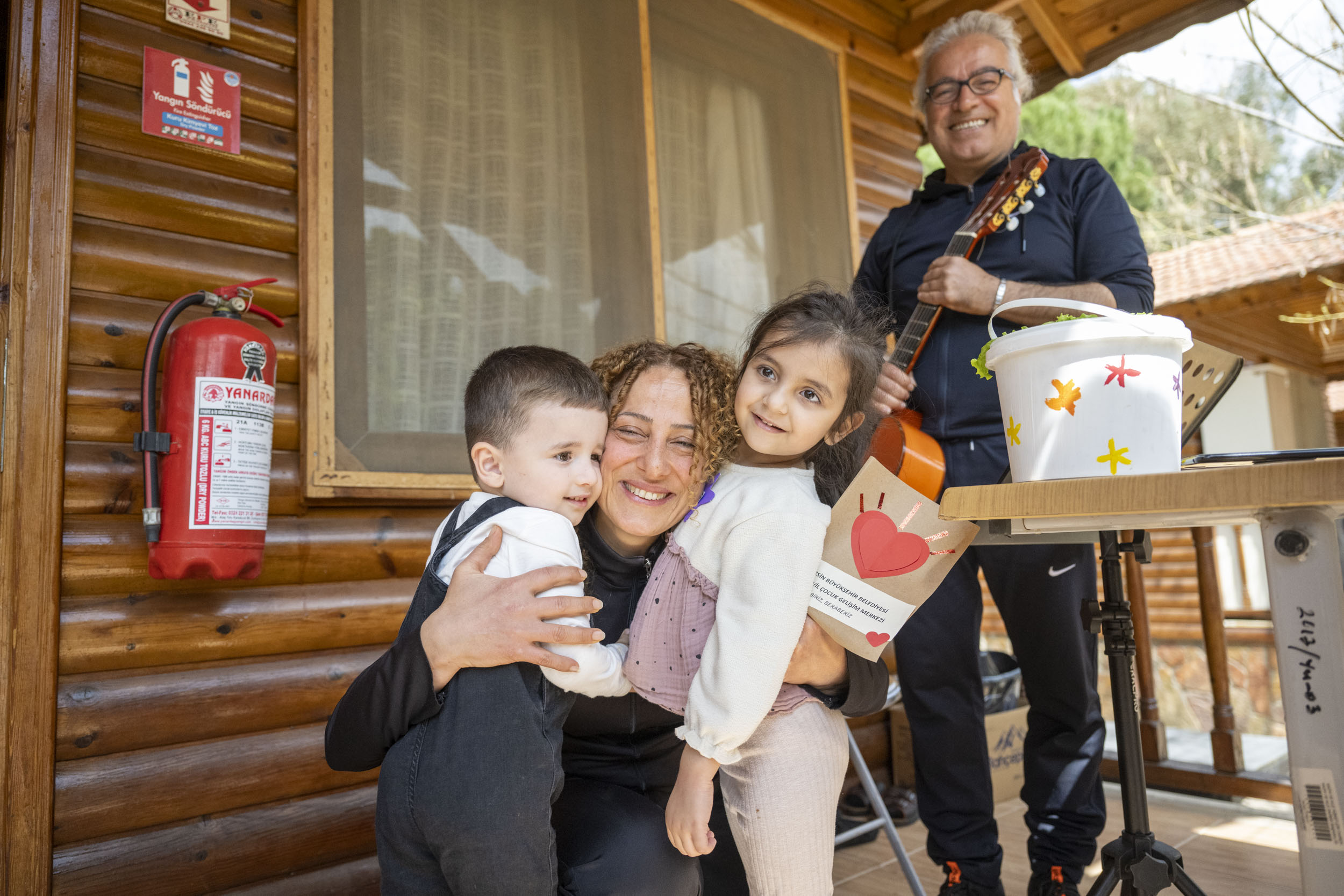 Deprem bölgesi Hatay’dan gelen müzisyen Nil ve Cüneyt Kitoğlu çifti de, bungalov evlerin bulunduğu alana gelen minik kreş çocuklarını şarkılarla karşıladılar.