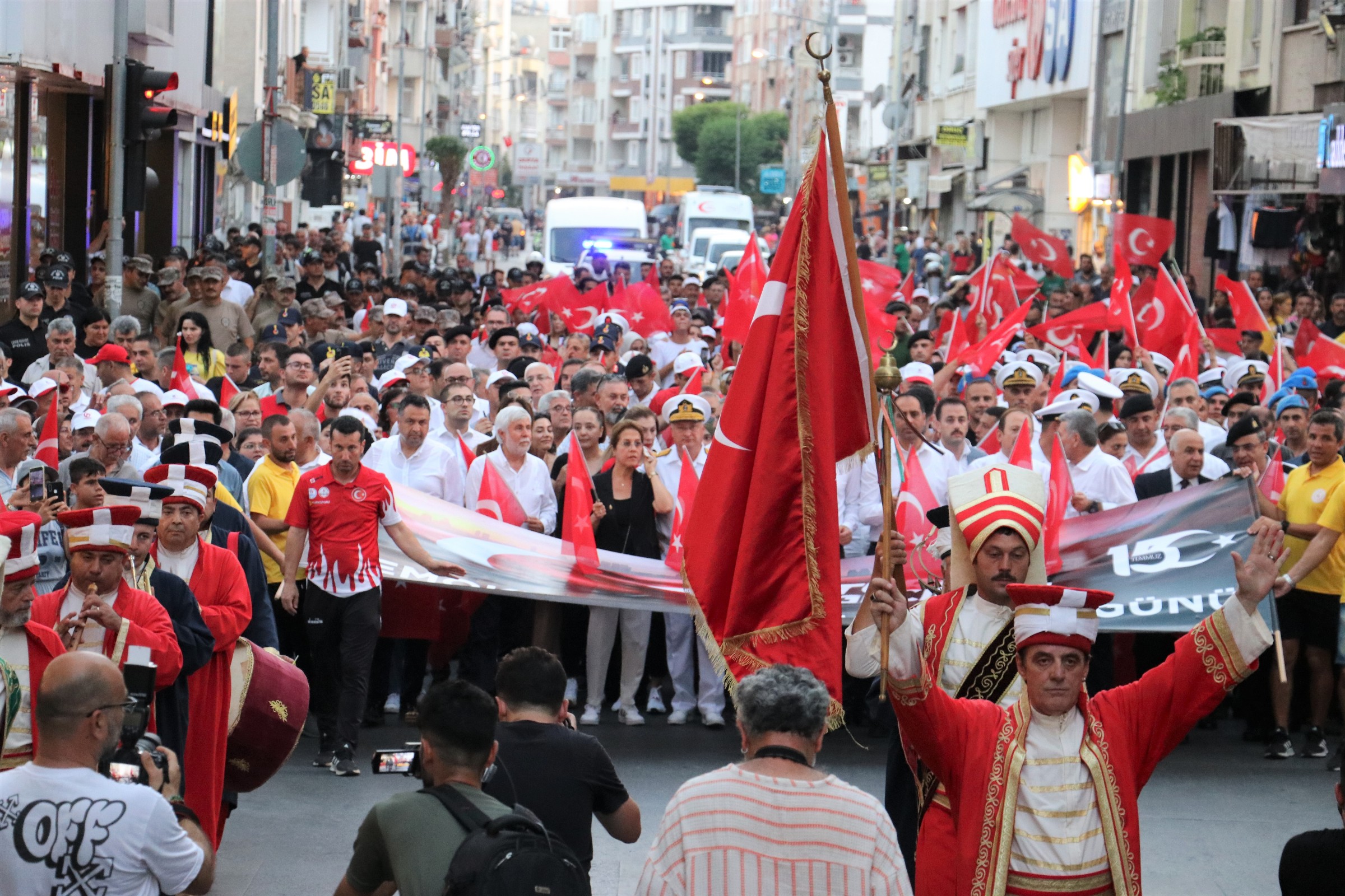 15 Temmuz şehitleri anısına düzenlenen yürüyüş, Millet Bahçesi’nden başlayarak Cumhuriyet Meydanı’na kadar sürdü. Başkan Yılmaz, Mersin Valisi Ali Hamza Pehlivan, kent protokolü ve vatandaşlarla birlikte mehteran eşliğinde yürüyerek, coşkuya ortak oldu.