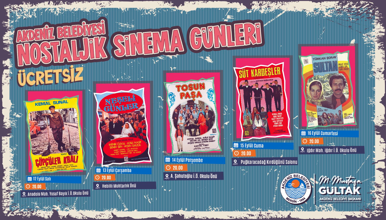 Akdeniz Belediyesi’nin yeniden canlandırdığı ve yoğun ilgi çeken nostaljik açık hava sinema günleri başlıyor. Etkinlik sayesinde, Türk Sinemasında iz bırakmış ve her izlendiğinde ayrı bir keyif veren filmler mahallelere geliyor. Akdeniz Belediyesi, kültürel ve sanatsal etkinliklere imza atmaya devam ediyor. Akdeniz Belediyesi; açık hava sinema günleri ile Mersinlileri yeniden geçmişe götürecek. Nostaljik etkinlik ile vatandaşlar, Yeşilçam’ın sevilen filmlerini aileleriyle birlikte açık havada ve beyaz perdede ücretsiz izlemenin keyfini yaşayacak. Kültür ve Sosyal İşler Müdürlüğü tarafından hazırlanan program kapsamında, ilk olarak 12 Eylül Salı günü (yarın) saat 20:00’de; Anadolu Mahallesi Yusuf Bayık İlköğretim Okulu önünde, tüm Türkiye’nin gönlünde taht kuran Kemal Sunal’ın unutulmaz filmi “Çöpçüler Kralı” seyirciyle buluşacak. Açık hava nostaljik sinema günlerinin, önceki yıllarda olduğu gibi yine her yaştan vatandaşın yoğun ilgisini çekmesi bekleniyor. Gösterim programı Açık hava film gösterimleri Akdeniz’in farklı mahallelerinde gerçekleşecek. Gösterim saatlerinin her akşam 20:00 olduğu program şöyle; 13 Eylül Çarşamba: Neşeli Günler – Hebilli Muhtarlık Önü; 14 Eylül Perşembe: Tosun Paşa – Abdullah Şahutoğlu İlköğretim Okulu; 15 Eylül Cuma: Süt Kardeşler – Puğkaracadağ Kır Düğünü Salonu; 16 Eylül Cumartesi: Sultan – Iğdır Mahallesi Iğdır İlköğretim Okulu.
