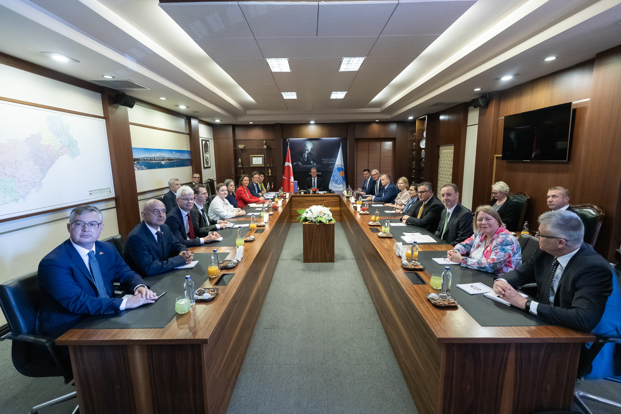 Mersin Büyükşehir Belediye Başkanı Vahap Seçer, Avrupa Birliği (AB) Türkiye Delegasyon Başkanı Büyükelçi Nikolaus Meyer-Landrut başkanlığında Hırvatistan Büyükelçisi Hrvoje Cvitanovic, Fransa Büyükelçisi Isabelle Dumont, Almanya Ticaret Ateşesi Roland Vegh, İtalya Ekonomi Danışmanı Maria De Stefani Spadafora, İrlanda Büyükelçisi John Mccullagh, Letonya Büyükelçisi Pēteris Vaıvars, Litvanya Büyükelçisi Ricardas Degutis, Lüksemburg Maslahatgüzarı Laura Lakaff, Malta Büyükelçisi Theresa Cutajar, Hollanda Maslahatgüzarı Nathalie Lintvelt, Polonya Büyükelçisi Maciej Lang, Portekiz Büyükelçisi Virginia Pina, Romanya Büyükelçisi Stefan Alexandru Tinca, Slovakya Büyükelçisi Jan Psenica, İsveç Büyükelçisi Malena Mard ve AB bürokratlarından oluşan heyet ile bir araya geldi.