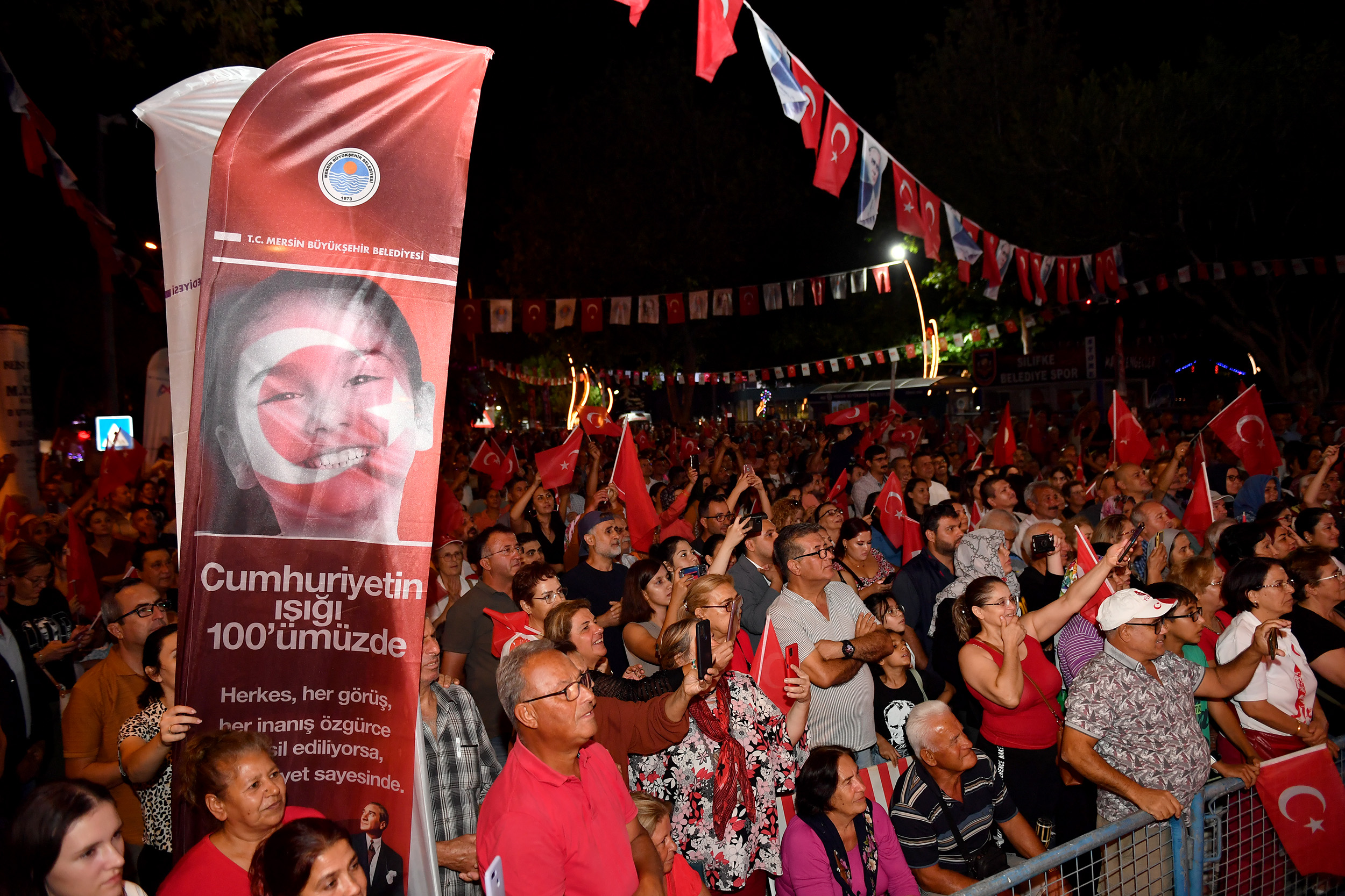 25 Ekim’de Tarsus Yarenlik Alanı’nda MBB Türk Halk Müziği Topluğu sahne alırken, 26 Ekim’de Mut Taşhan’da MBB Pop Orkestrası sahne aldı. Bu kapsamda yapılan konserlerden biri de Silifke Anıt Meydanı’nda yapılan Ali Altay konseri oldu. Konserden önce gerçekleşen kortejde ellerinde bayraklarla konser alanına yürüyen vatandaşlar 100. yılı sloganlar eşliğinde kutladı. Yürüyüşün ardından Silifkeli sanatçı Ali Altay’ın söylediği şarkılarla eğlenen vatandaşlar, sanatçının hareketli sahne performansıyla keyifli saatler yaşadı. Vatandaşlar, Cumhuriyet’in kuruşunun 100. yılına yakışır etkinlikler düzenlediği için Büyükşehir Belediyesi’ne teşekkürlerini iletti.
