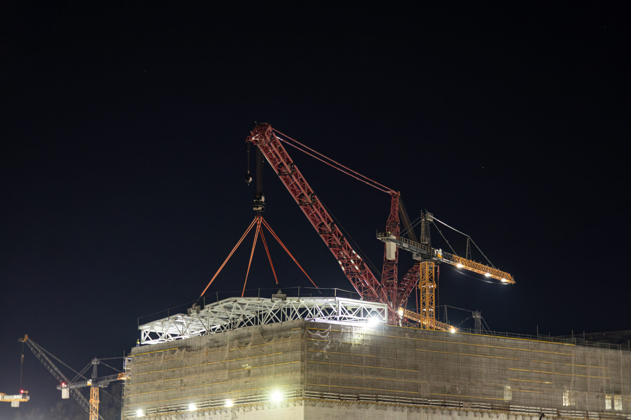 Toplam ağırlığı 1142 ton olan ve 9 genişletilmiş kirişten oluşan türbin binasının çatısında kurulum süreci üç aydan fazla sürdü. Her biri 95 ila 175 ton ağırlığında ve 61 metre uzunluğunda olan kirişler, özel olarak hazırlanmış iki kızak üzerinde eş zamanlı olarak birleştirilerek monte edildi. Kurulum için Liebherr LR 13000 paletli vinç kullanıldı. Türbin binasındaki her bir kiriş on milimetre hassasiyetle monte edildiğinden çalışmalar dikkatli bir hazırlığın yanı sıra yüksek düzeyde organizasyon ve inşaat planlaması gerektirdi.