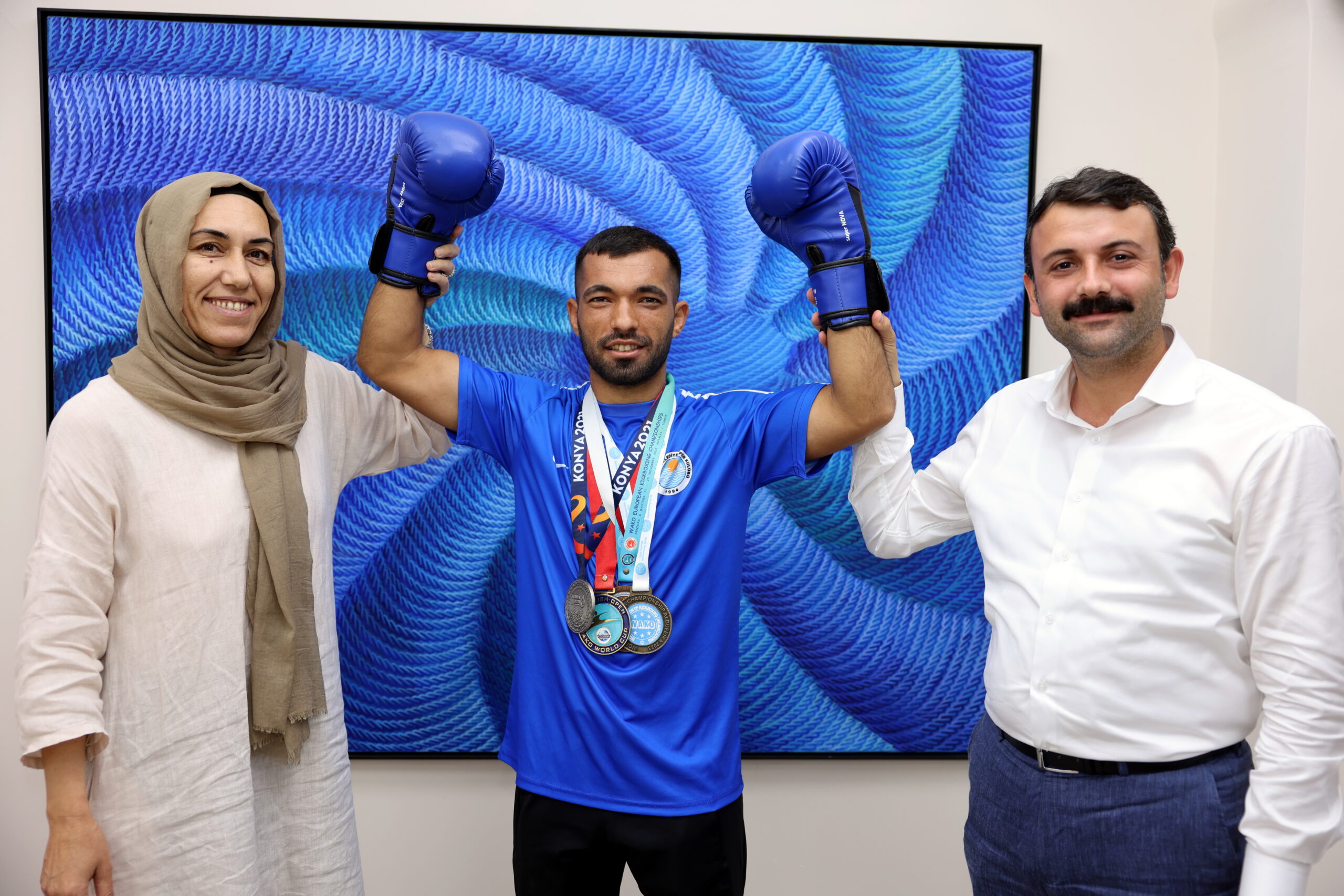Akdeniz Belediye Spor Kulübü oyuncusu Milli Kick Boks sporcusu Hatip Emlek, önümüzdeki aylarda Yunanistan’ın Başkenti Atina ile Azerbaycan’ın Başkenti Bakü’de düzenlenecek Avrupa Kick Boks şampiyonası ve profesyonel boks müsabakası öncesi, Akdeniz Belediyesi Eş Başkanları Nuriye Arslan ve Hoşyar Sarıyıldız’ı ziyaret etti.