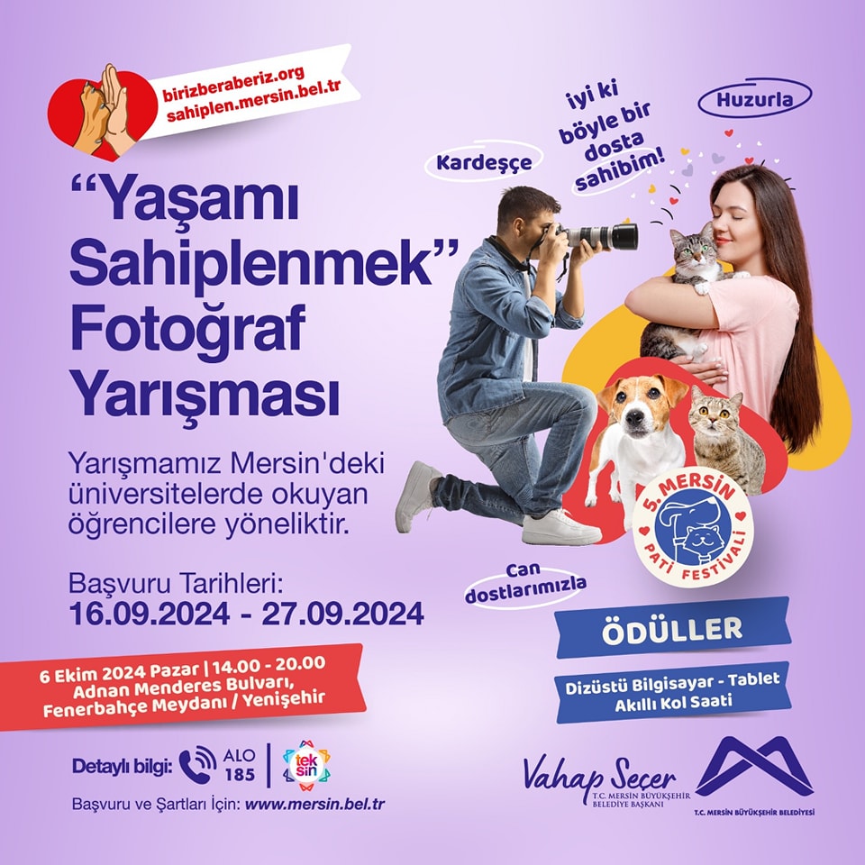 Mersin Büyükşehir Belediyesi’nin geleneksel hale getirdiği ve Türkiye’nin en kapsamlı hayvan festivali Patifest’in 5.’si 6 Ekim’de Fenerbahçe Meydanı’nda yapılacak. Bu yıl ‘Yaşamı Sahiplen, Destek Büyükşehir’den’ mottosuyla yapılacak olan festival öncesi, fotoğraf ve resim yarışması düzenleniyor. İlk ve ortaokul öğrencilerinin resim, üniversite öğrencilerinin ise çektiği fotoğrafla katılabileceği yarışmada, katılımcılardan patili dostları anlatmaları istenecek. 16-27 Eylül tarihleri arasında resim ve fotoğrafların kabul edileceği yarışmayla ilgili bilgiye sahiplen.mersin.bel.tr adresinden ulaşılabilecek.