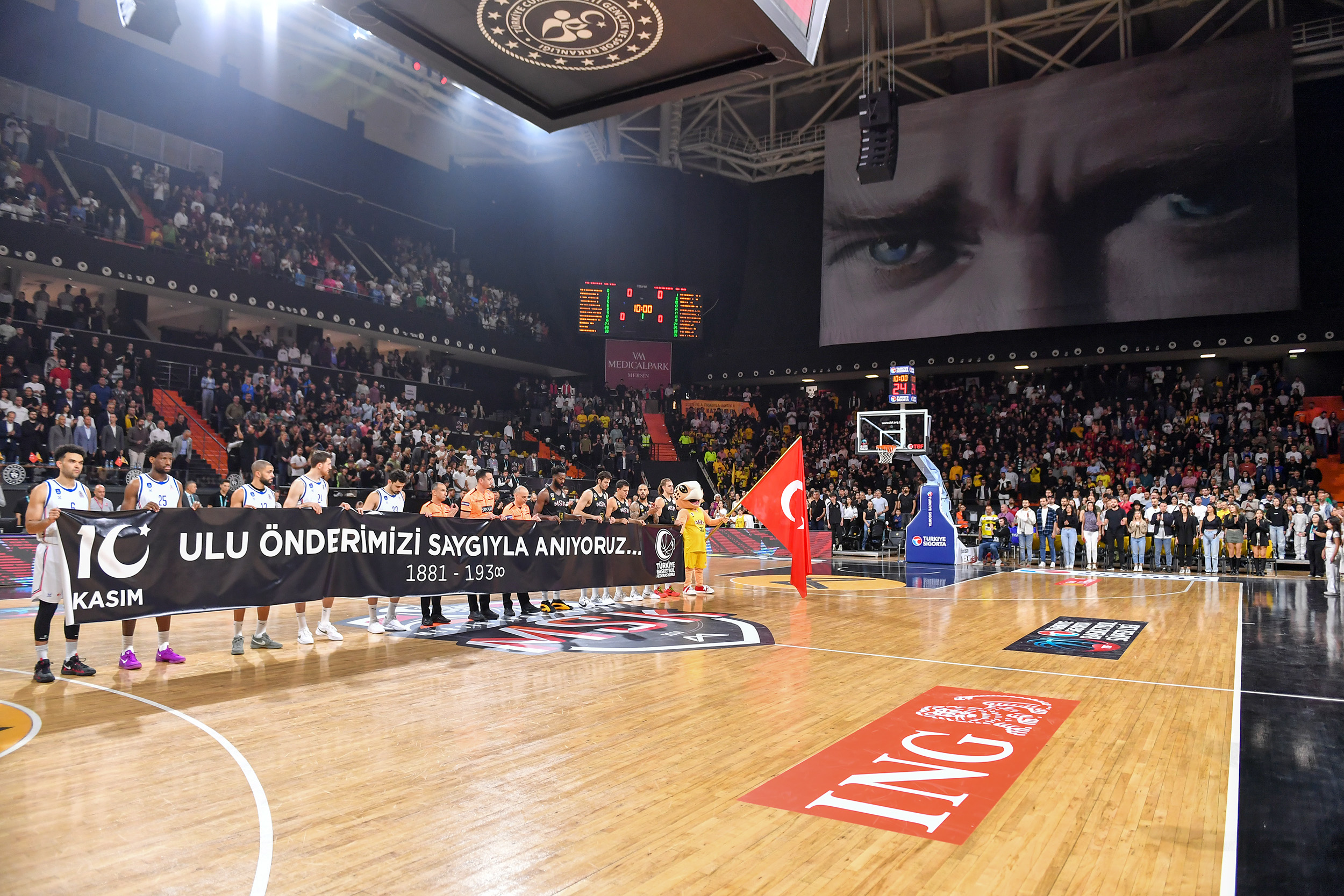 Türkiye Basketbol Süper Ligi 6. hafta karşılaşmasında Mersin Spor Kulübü Erkek Basketbol Takımı evinde Anadolu Efes’i konuk etti. Mersinli basketbolseverlerin büyük destek gösterdiği müsabaka öncesinde Türkiye Cumhuriyeti’nin kurucusu Ulu Önder Gazi Mustafa Kemal Atatürk’ün aramızdan ayrılışının 86. yıl dönümü nedeni ile saygı duruşunda bulunulurken, taraftarlar da hazırladıkları koreografi ile dev Atatürk posteri açıp ‘Bu kalp seni unutur mu?’ isimli şarkıyı seslendirdiler.