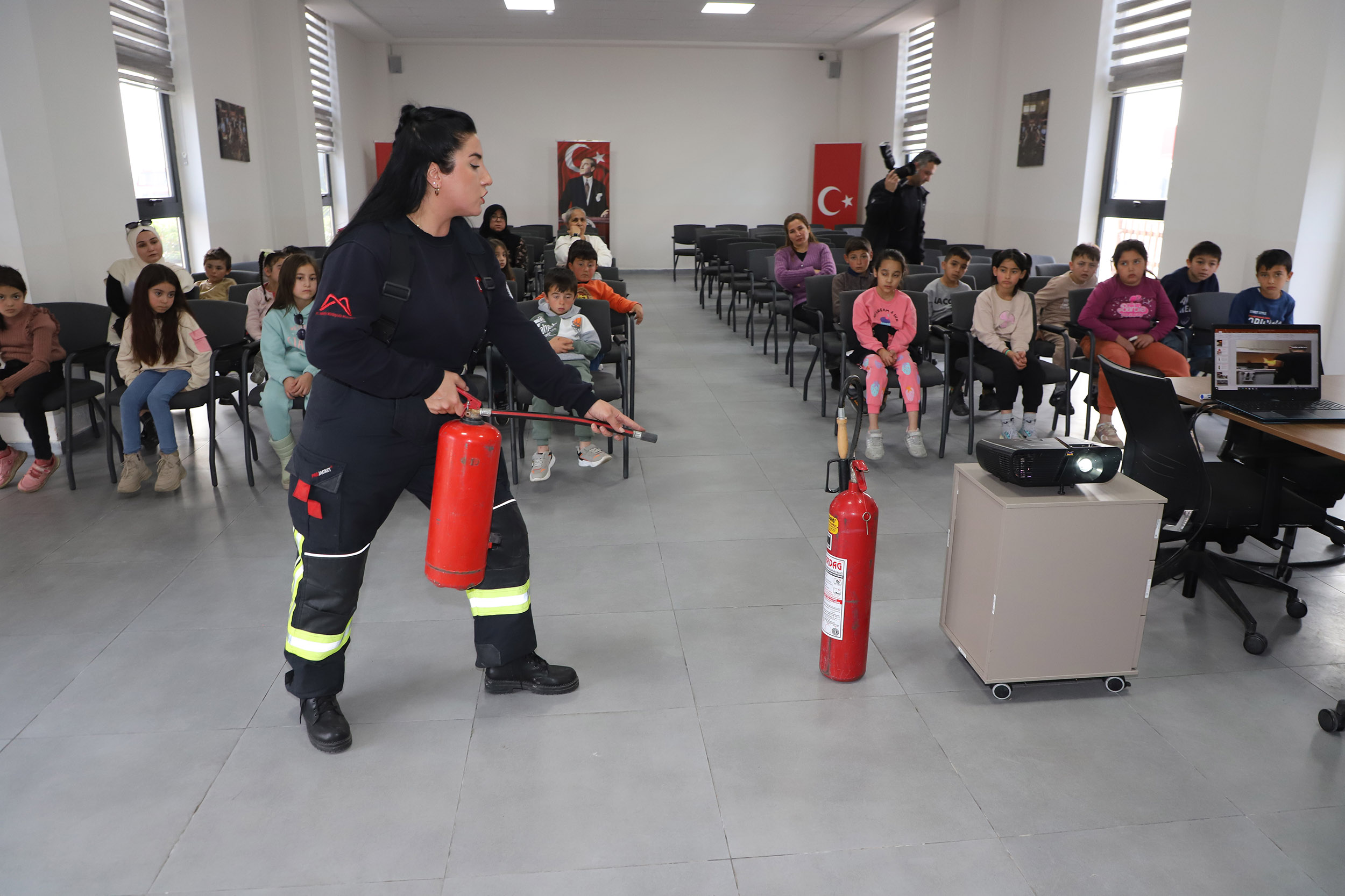 Portatif yangın söndürücü tüpler hakkında da bilgiler verilen eğitimde, olası bir yangın durumunda sınıftan tahliye senaryosu uygulanarak öğrenciler, toplantı salonundan kontrollü bir şekilde dışarıdaki toplanma alanına alındı. Daha sonra bir araç yangını senaryosu üzerinde yangın söndürme tecrübesi yaşayan çocuklar, itfaiye aracına bindi ve lansdan su sıkarak yanan aracı söndürdü. Son olarak çocuk eğitim alanına alınan öğrenciler, itfaiyeci kostümü giydirilerek çocuk parkurunda eğlenceli anlar yaşadılar.