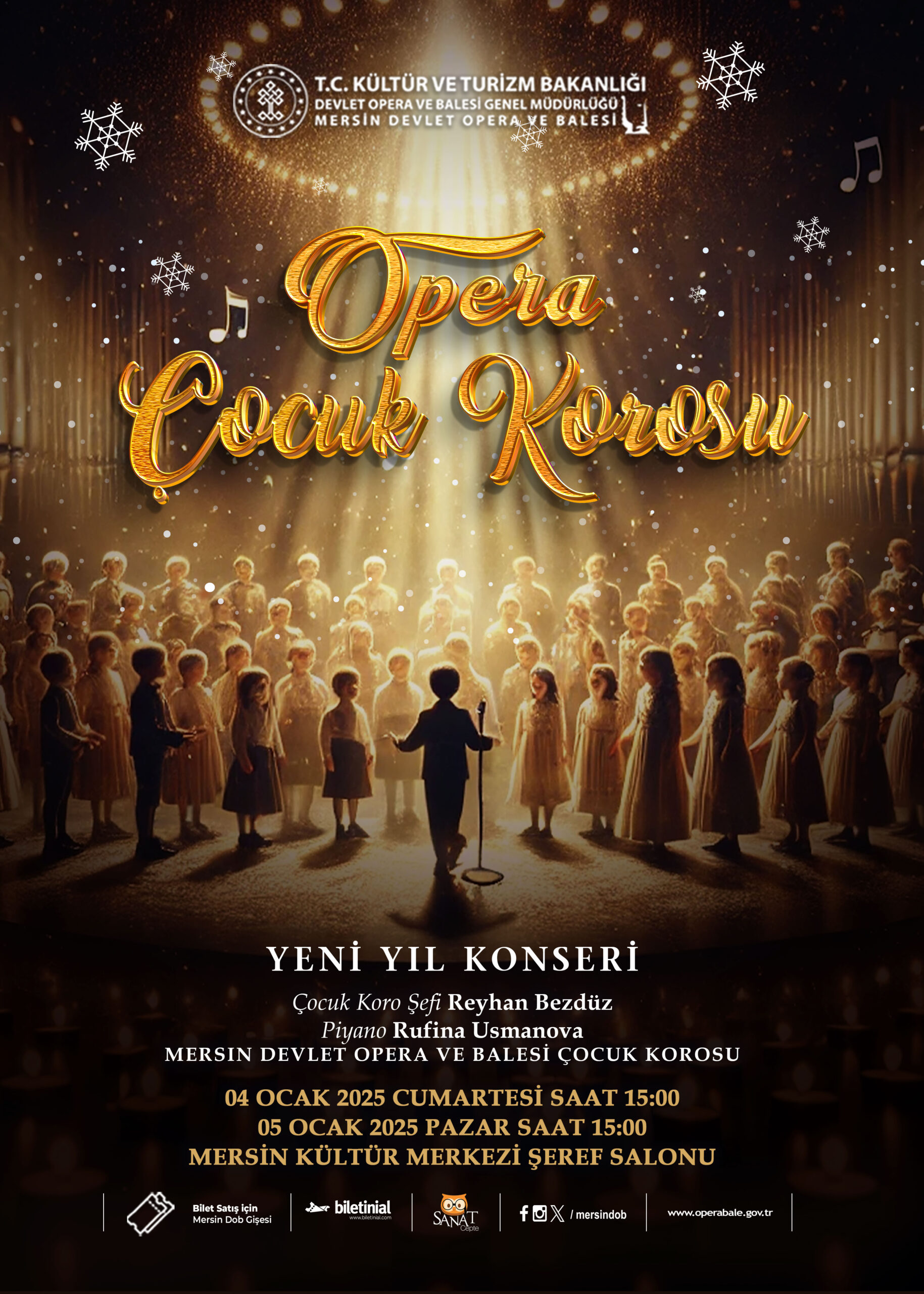4 Ocak 2025 Cumartesi ve 5 Ocak 2025 Pazar günü saat 15:00’de Mersin Devlet Opera ve Balesi Şeref Salonu’nda gerçekleşecek olan konser, Bizet’nin ölümsüz eseri Carmen’in de seslendireceği ilk eser ile sizi büyüleyici bir müzikal yolculuğa çıkaracak. Dostluk, mutluluk ve huzur temalarının öne çıktığı bu özel günde, çocuklarımız seçkin şarkılarla barış, sevgi ve güzellik mesajlarıyla dünyayı kucaklayacak.