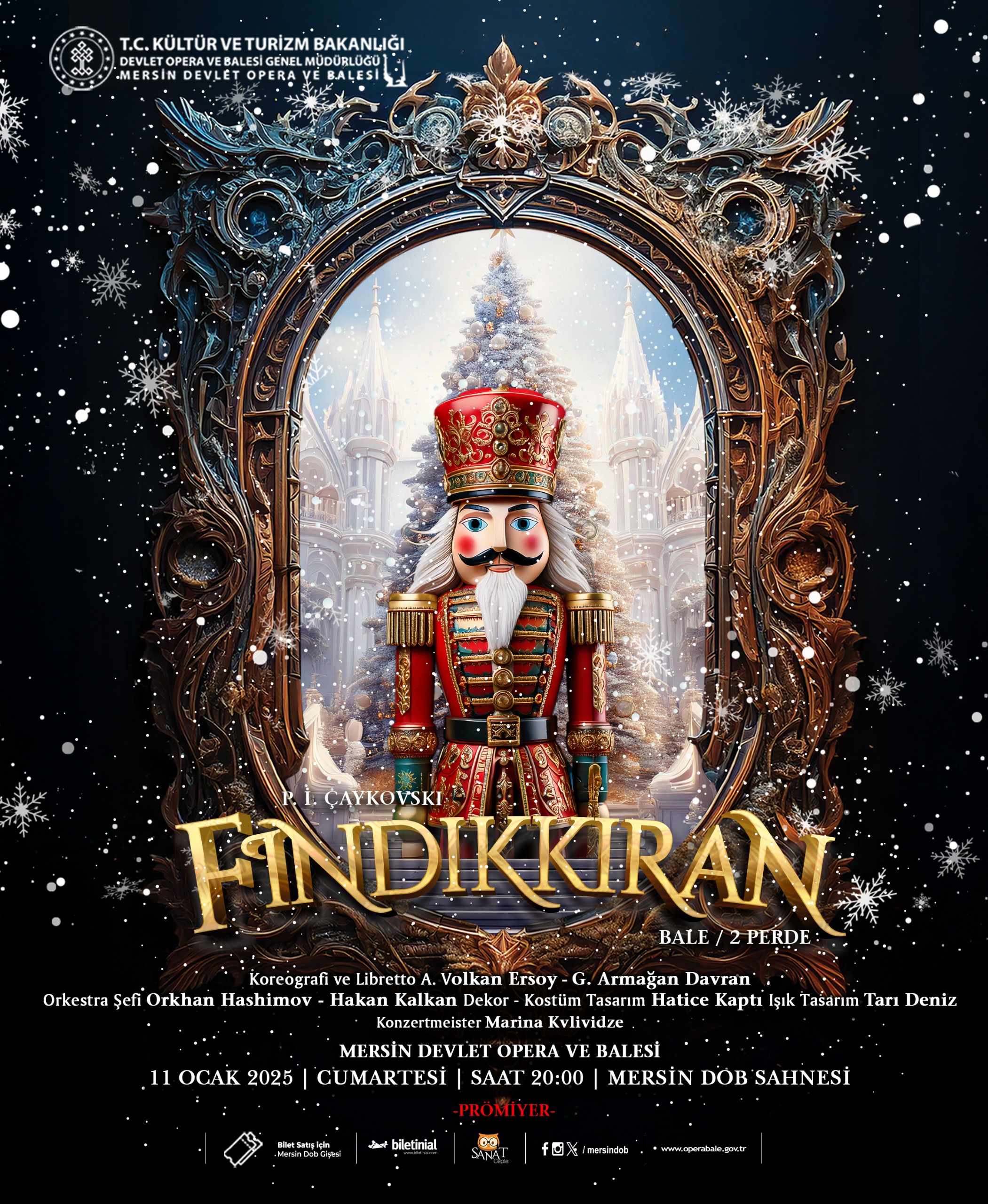 2013 yılındaki prömiyerinden bu yana büyük bir ilgiyle izlenen ve sahnelendiği her yerde biletleri dakikalar içinde tükenen “Fındıkkıran Balesi” 11 Ocak 2025 Cumartesi akşamı saat 20.00’de Mersin Kültür Merkezi Opera Salonu’nda prömiyeri gerçekleşecek. Ocak ayı içerisinde iki gösterim daha yapılacak olup, 14 Ocak 2025 Salı akşamı saat 20.00 ve 18 Ocak 2025 Cumartesi Saat 15.00’de Mersin Kültür Merkezi Opera Salonu’nda sahnelenecek.