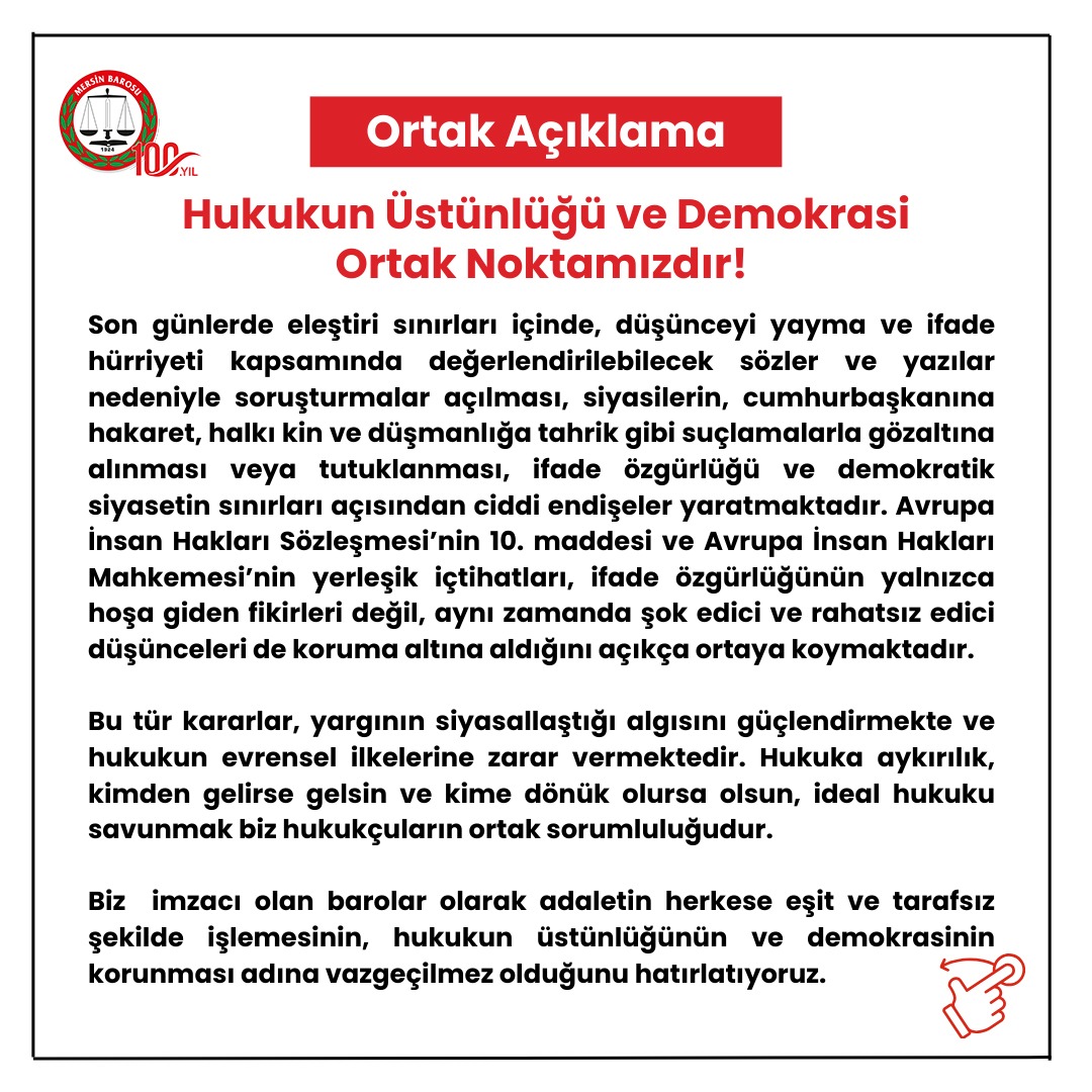 Mersin Barosu ile birlikte 63 baro yaptığı ortak yazılı açıklamasında, adaletin herkese eşit ve tarafsız şekilde işlemesi gerektiğini vurgulayarak, “Son günlerde eleştiri sınırları içinde, düşünceyi yayma ve ifade hürriyeti kapsamında değerlendirilebilecek sözler ve yazılar nedeniyle soruşturmalar açılması, siyasilerin, cumhurbaşkanına hakaret, halkı kin ve düşmanlığa tahrik gibi suçlamalarla gözaltına alınması veya tutuklanması, ifade özgürlüğü ve demokratik siyasetin sınırları açısından ciddi endişeler yaratmaktadır. Avrupa İnsan Hakları Sözleşmesi’nin 10. maddesi ve Avrupa İnsan Hakları Mahkemesi’nin yerleşik içtihatları, ifade özgürlüğünün yalnızca hoşa giden fikirleri değil, aynı zamanda şok edici ve rahatsız edici düşünceleri de koruma altına aldığını açıkça ortaya koymaktadır.