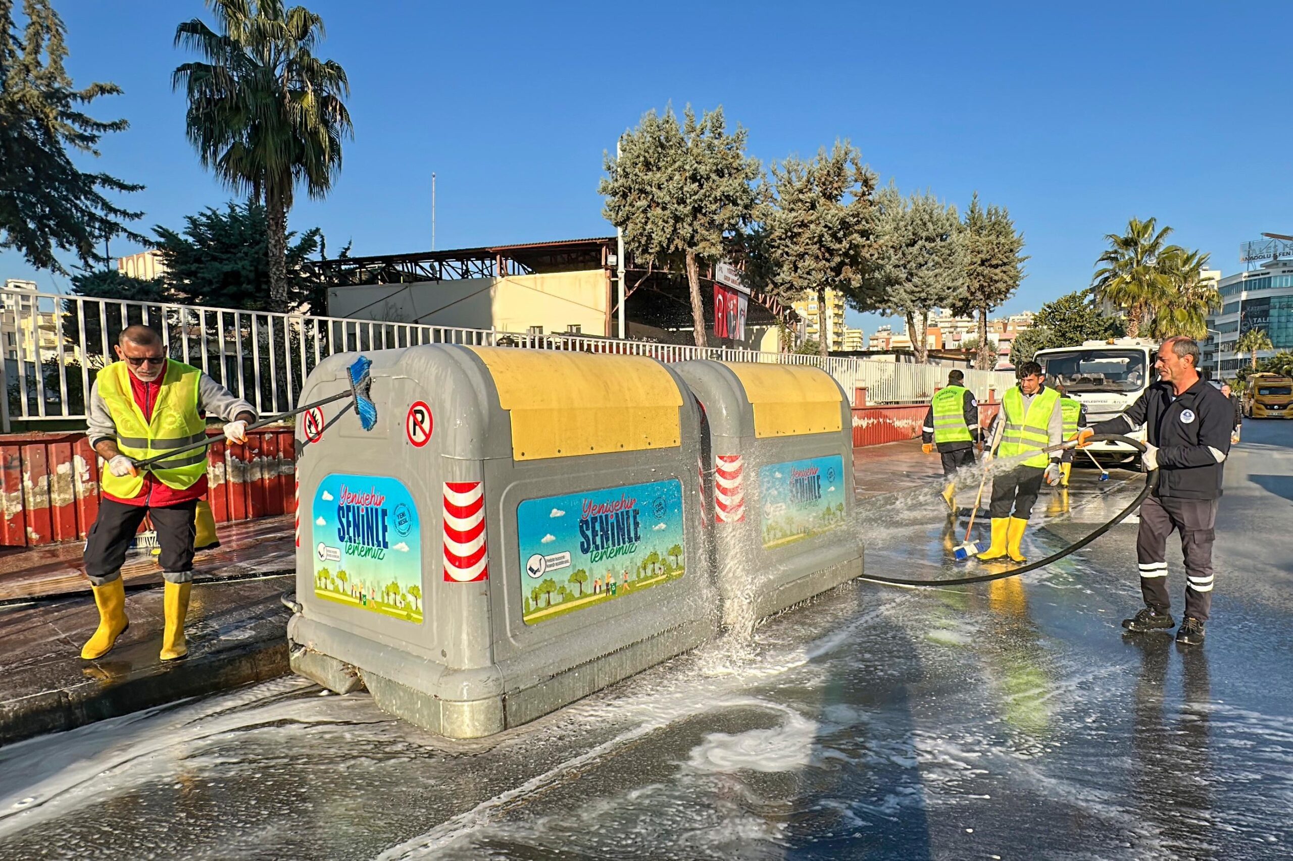 Yenişehir Belediyesi Temizlik İşleri Müdürlüğü ekipleri konteyner yıkama çalışmalarının belirli periyotlarla sürdürerek, halk sağlığını tehdit eden unsurları ortadan kaldırmaya yönelik titiz bir çalışma yürütüyor. Yenişehir Belediyesi, temizlik çalışmalarını yalnızca çöplerin toplanmasıyla sınırlı tutmayarak, çöp konteynerlerinin hijyenik kalmasını da öncelikli bir konu olarak ele alıyor. Çöp konteynerlerinin düzenli olarak yıkanması ve dezenfekte edilmesiyle, kötü kokular ve bakteri oluşumuna karşı etkili bir mücadele yürütülüyor. Ekipler konteynerleri hem içeriden hem de dışarıdan dezenfekte ediyor.