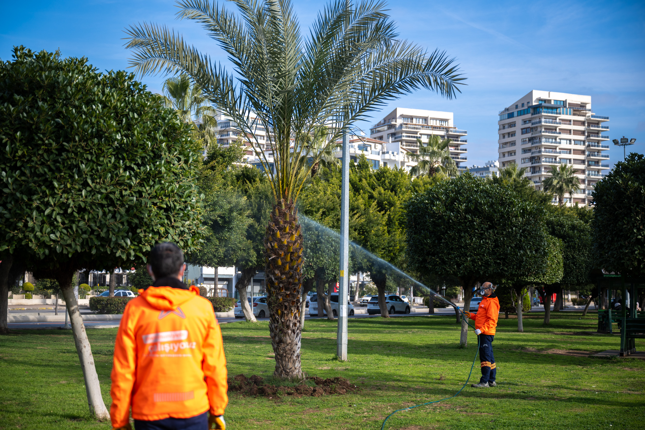Büyükşehir Belediyesi Park ve Bahçeler Dairesi Başkanlığı’nda Ziraat Mühendisi olarak görev yapan Bülent Gül, Kırmızı Palmiye böceği ile etkin bir mücadele yöntemi izlediklerini belirterek, “Kırmızı Palmiye böceği, şehrimizin simgesi olan Palmiye ağaçlarımıza zarar veren bir böcektir. Yalancı Hurma dediğimiz bitkilerimizin baş düşmanı olan bir zararlıdır. Daha sonra Palmiyelere de sirayet ediyor. 12 derecenin üstündeki havalarda daha çok faaliyet gösteriyor. Hava sıcaklığının artmasıyla birlikte, takip ettiğimiz Palmiye böcekleri ile ilgili mücadele kapsamında ilaçlamalar yapıyoruz” ifadelerini kullandı.