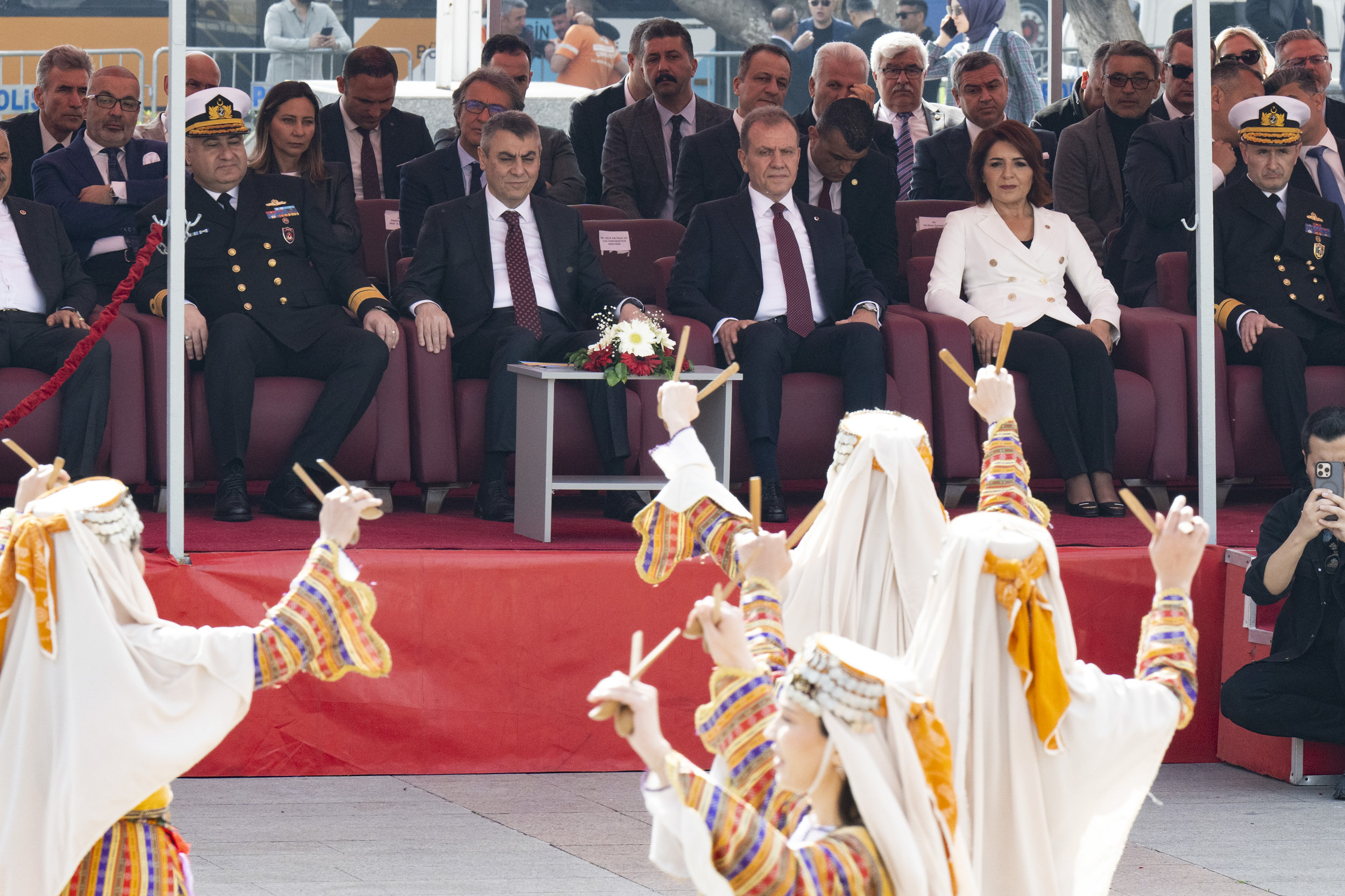 Cumhuriyet Meydanı’nda devam eden tören, Vali Toros, Tuğamiral Karataş ve Başkan Seçer tarafından Atatürk Anıtı’na çelenk sunulması ile başladı. Ardından saygı duruşunda bulunuldu ve İstiklâl Marşı eşliğinde Şanlı Bayrak göndere çekildi. Törende, bir öğrenci tarafından şiir okunmasının ardından, Büyükşehir Belediyesi Halk Oyunları Ekibi gösterilerini gerçekleştirdi.
