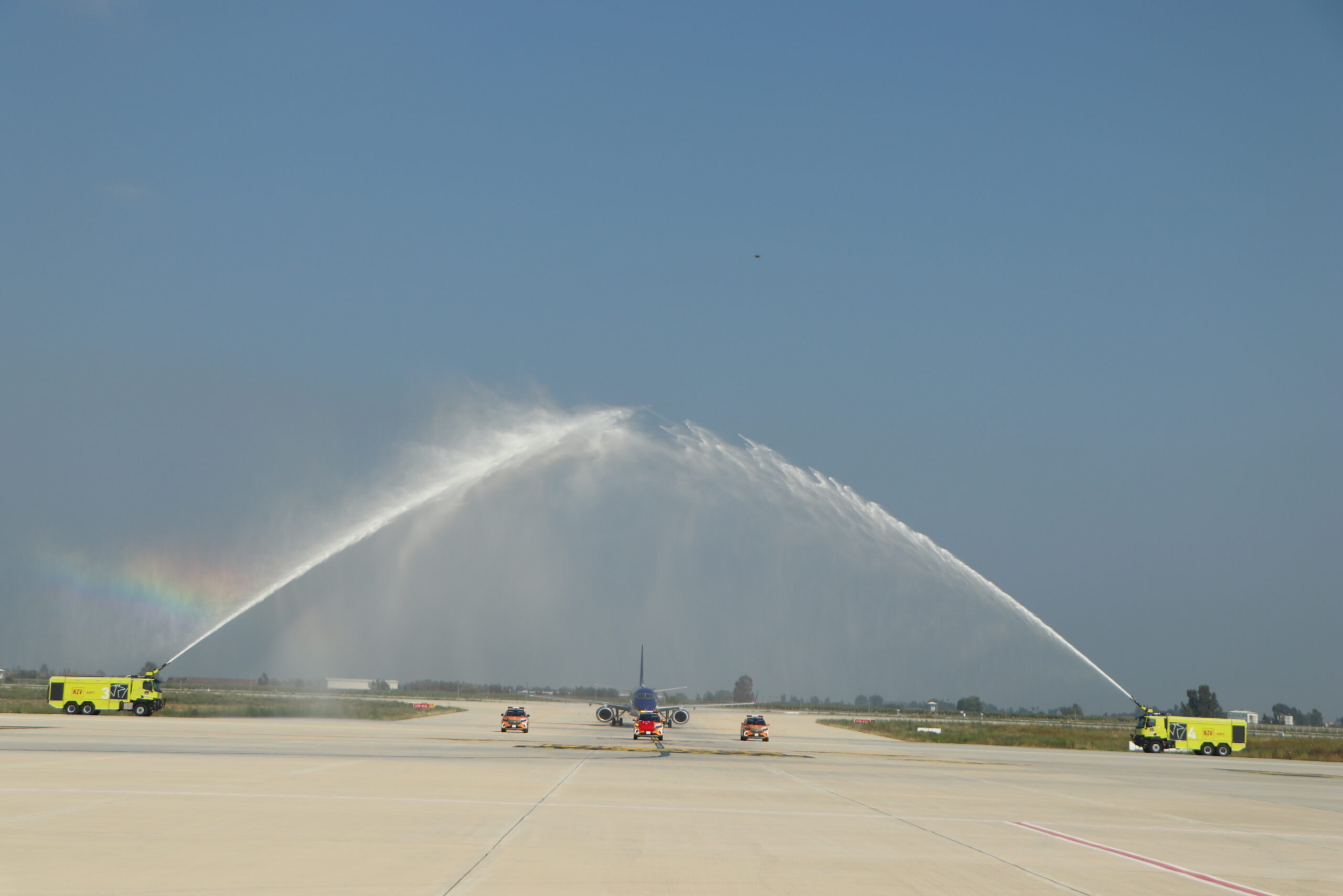 İlk uçuş törenle karşılandı. Azerbaycan’dan gelen uçak, pistte su takı gösterisi ile karşılandı. Uçağa apron boyunca üçlü Follow Me aracı eşlik ederek uçağın köprüye güvenli şekilde yanaşması sağlandı.