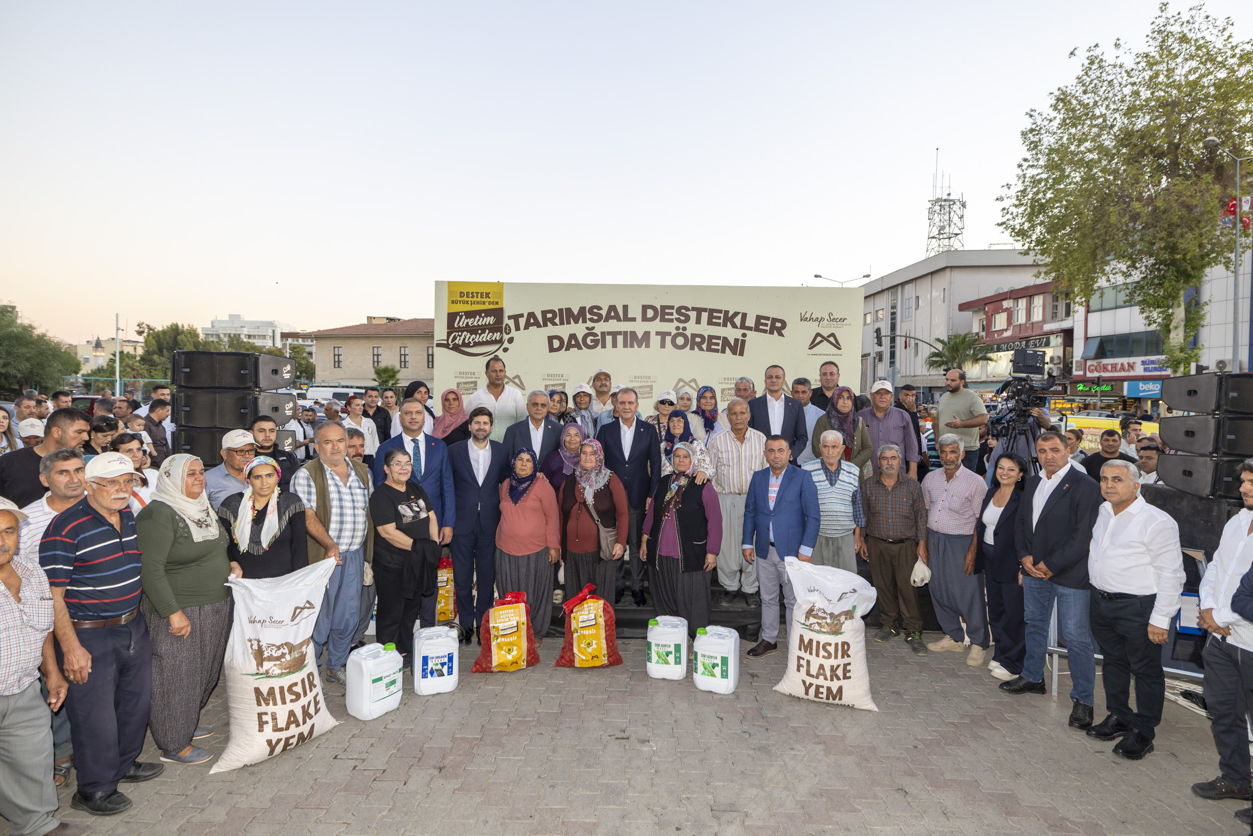 Türkiye Belediyeler Birliği Başkan Vekili ve Mersin Büyükşehir Belediye Başkanı Vahap Seçer, Tarımsal Hizmetler Dairesi Başkanlığı tarafından düzenlenen ‘Mısır Flake, Nergis Soğanı, Güneş Paneli ve Sıvı Gübre Dağıtım Töreni’ne katılım sağladı. Düzenlenen tören ile Tarsus ve Çamlıyayla ilçelerinde yaşayan üretici ve çiftçiler; Güneş Paneli, Sıvı Gübre, Büyükbaş Hayvan Yetiştiricilerine Yem Desteği ve Nergis Soğanı Desteği olmak üzere 4 farklı proje başlığı altındaki destekten faydalandı.