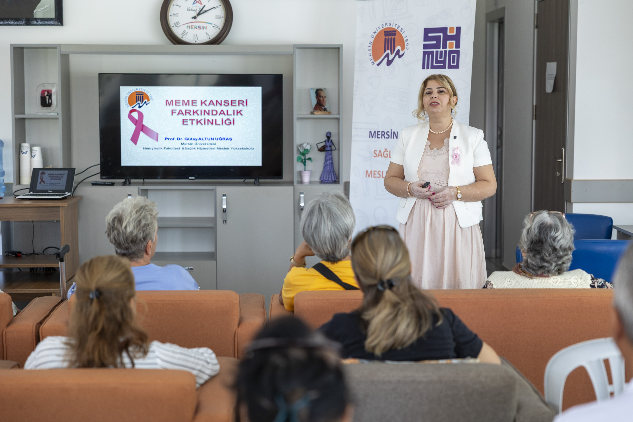 Eğitim, Mersin Üniversitesi Hemşirelik Fakültesi Öğretim Üyesi Prof. Dr. Gülay Altun Uğraş tarafından verildi. Etkinlikte, meme kanserinin ne olduğu, risk faktörleri, evde erken tanı için yapılabilecek kontroller ve düzenli muayenenin önemi anlatıldı. Prof. Dr. Uğraş, katılımcılara meme muayenesinin nasıl yapılacağını uygulamalı olarak gösterdi. Gerçekleştirilen sunumda, meme maketi üzerinde örneklemeli anlatım yapılarak kadınların kendi kendine muayene yöntemlerini doğru şekilde öğrenmeleri sağlandı.