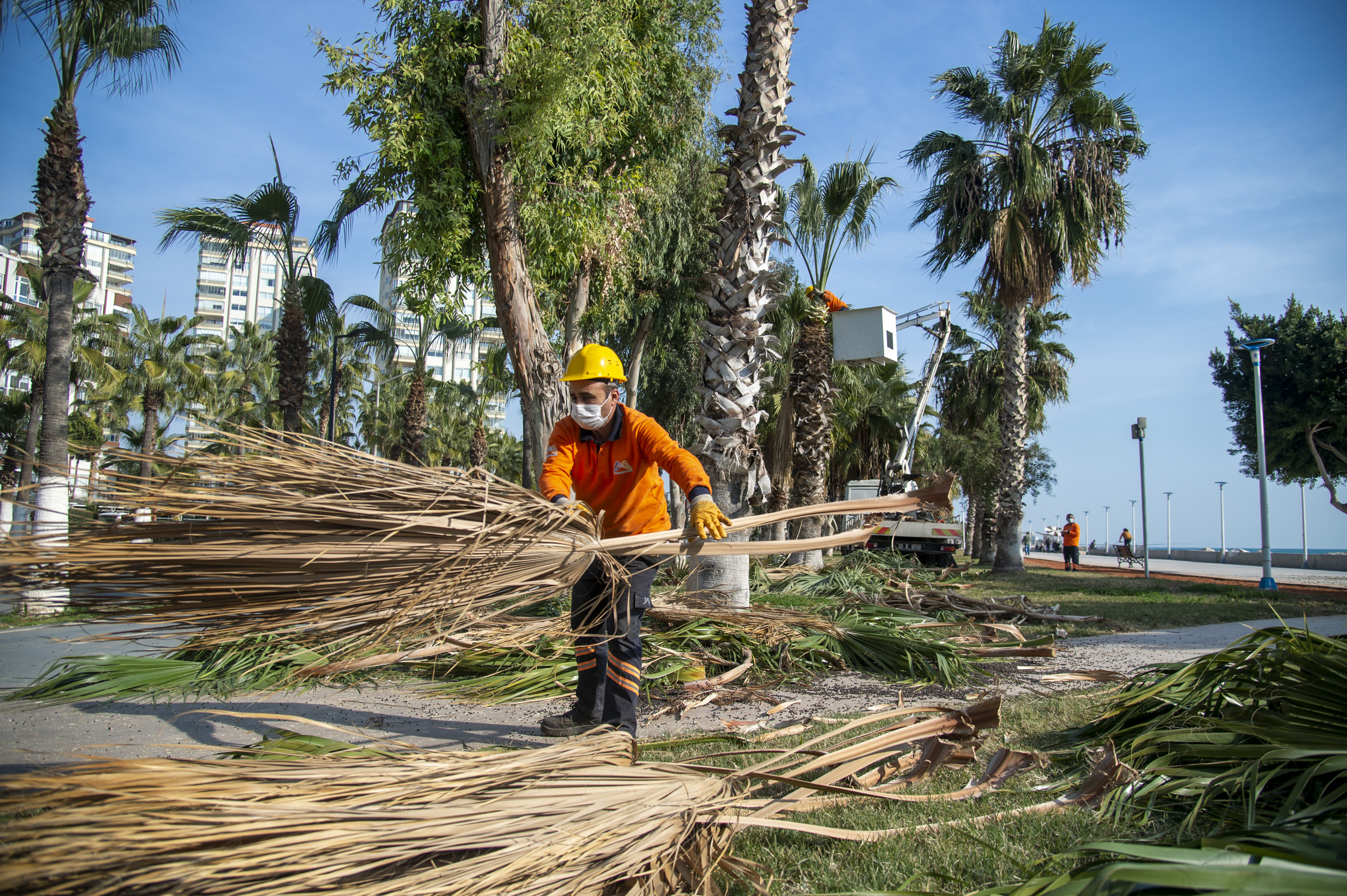 Ekipler kovalı vinç üzerine çıkarak budamayı gerçekleştiriyor. Budama sırasında meydana gelen kalıntılar ise ekipler tarafından temizleniyor. Mersin’in simgelerinden 100 yaşına kadar yaşayabilen ve boyu 30 metreye kadar uzanan palmiyelere Büyükşehir özenle bakıyor.